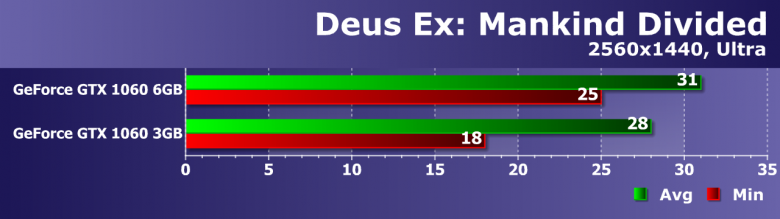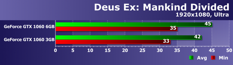 В игре из семейства Deus Ex мы видим почти то же самое, что и в предыдущем проекте. Даже при условии выбора ультра-настроек в Full HD-разрешении две видеокарты GeForce GTX 1060 с разным объемом видеопамяти показали несколько разную скорость рендеринга, но эта небольшая разница обусловлена исключительно отличиями в их вычислительной и текстурной производительности.