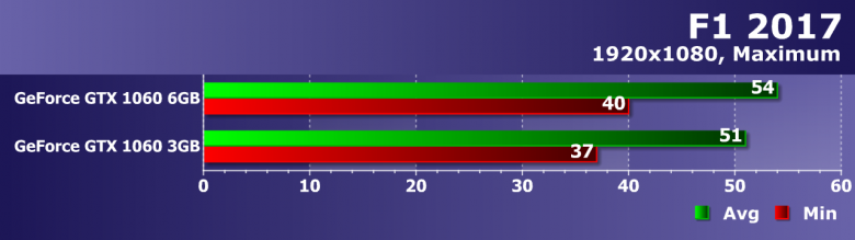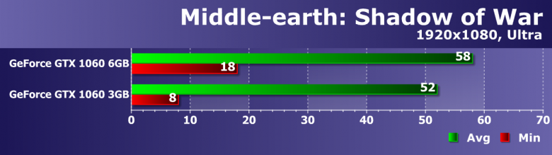 При максимальных настройках в игре средняя частота кадров для двух вариантов видеокарт близка (разница объясняется отличиями текстурной и вычислительной производительности), а вот минимальные значения даже с учетом их странности отличаются почти вдвое, что говорит о том, что в случае варианта GTX 1060 3 ГБ, падения производительности могут быть куда более ощутимыми, чем при установке видеокарты с 6 ГБ памяти. Но такие падения в реальной игре весьма редки и комфорт на обеих видеокартах будет примерно одинаковым.