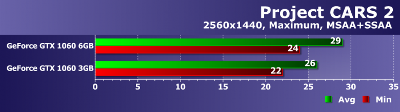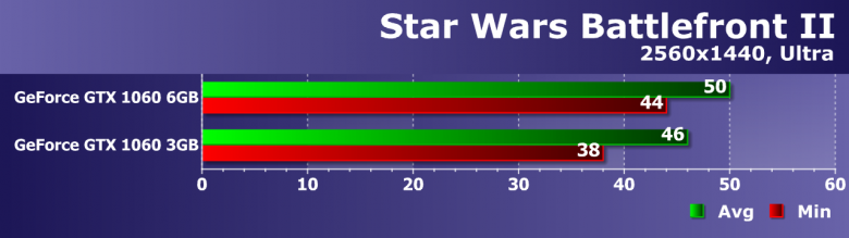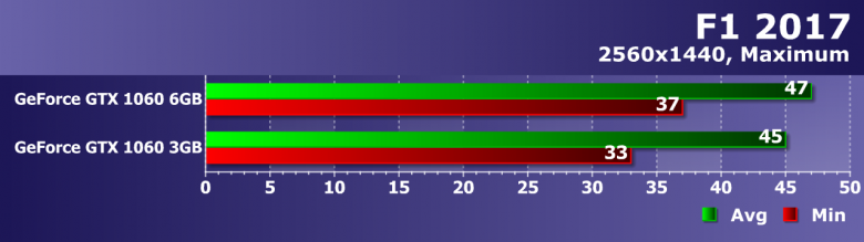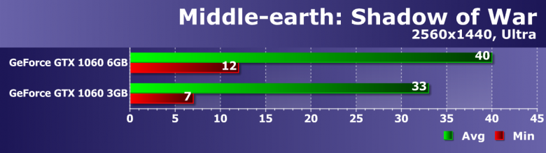 При переходе к более высокому разрешению WQHD ситуация для GeForce GTX 1060 3 ГБ немного ухудшилась, и младший вариант видеокарты отстает от имеющего больший объем VRAM уже сильнее, особенно по минимальной частоте кадров. Но разница между 3 ГБ и 6 ГБ вовсе не радикальная и тут — бо́льшая емкость видеопамяти позволяет обеспечить от 37 FPS, а меньшая — от 33 FPS. То есть на обеих вариантах GTX 1060 вполне можно играть с минимальным уровнем комфорта, и разницу между ними без инструментов измерения FPS почувствовать вряд ли получится.