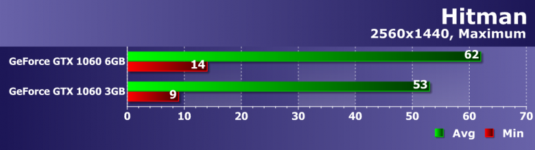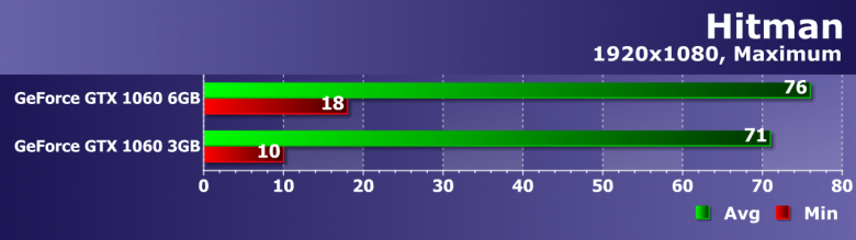 Во-первых, нужно сразу отметить, что счетчик минимальной частоты кадров в бенчмарке игры Hitman слишком жесток и показывает нереалистичные значения. По которым, впрочем, хорошо заметна разница в производительности между видеокартами GeForce GTX 1060 с 3 и 6 ГБ в экстремальных случаях, вроде единовременной подгрузки большого объема ресурсов из ОЗУ.