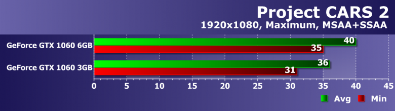 С визуальной точки зрения, Project Cars 2 является одной из самых красивых и реалистичных гоночных игр. К сожалению, в игре нет бенчмарка, зато можно записывать заезды и проигрывать их повторы, замеряя производительность рендеринга. Мы использовали профиль максимальных настроек качества (Maximum) и сочетание двух методов полноэкранного сглаживания: MSAA и SSAA — для большего раскрытия возможностей GPU и VRAM, исходя из тематики нашего материала. Подробнее о методике тестирования и графических настройках можно прочитать в обзоре игры.