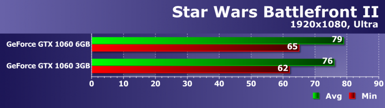 Похоже, что в данной игре нельзя полностью отключить динамическое разрешение рендеринга, что вполне может сказываться на результатах тестов. Как видно, в относительно низком Full HD-разрешении в игре по «Звездным войнам» нет никакой разницы в производительности между вариантами GeForce GTX 1060 с 3 ГБ и 6 ГБ, не связанной с мощностью GPU даже при условии ультравысоких настроек.