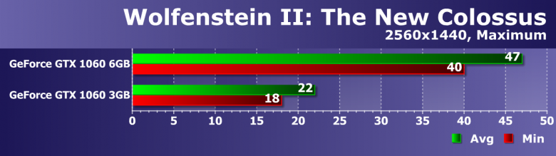 Понятно, что особых изменений тут быть не могло, и при повышении разрешения экрана до WQHD мы увидели ту же самую ситуацию для младшей видеокарты, даже еще хуже. Скорость рендеринга при максимальных настройках в повышенном разрешении для старшей платы с 6 ГБ составляет вполне приличные 40–47 FPS без падений ниже, а младший вариант GeForce GTX 1060 3 ГБ обрушился до 18–22 FPS, что никак нельзя назвать комфортной частотой кадров ни при каких условиях.
