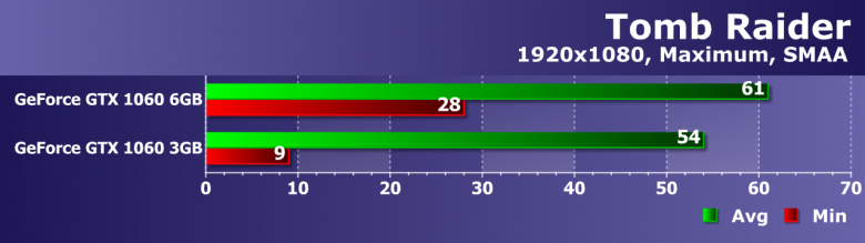 Игра серии Tomb Raider вышла давно, но она весьма ресурсоемкая, и это касается в том числе и требований к объему видеопамяти. Ситуация похожа на ту, что мы видели, например, в Hitman. При максимальных настройках и разрешении 1920×1080 в этой игре разница между средней частотой кадров для моделей GeForce GTX 1060 с 3 и 6 ГБ видеопамяти невелика и объясняется скорее разным количеством исполнительных блоков, чем отличающимся объемом VRAM.