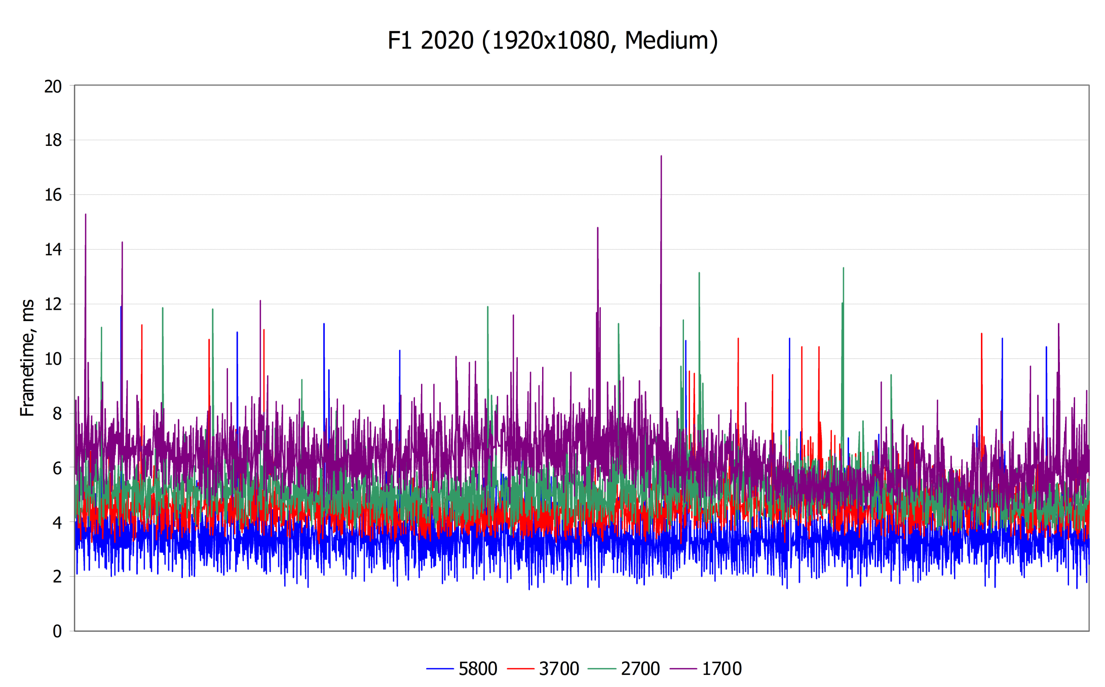 Разница между поколениями Zen тут хоть и заметна, но гораздо меньше, чем в предыдущей игре. Здесь же явно проваливается только самый старый Ryzen 7 1700, а остальные CPU показали близкие результаты, так как игре важнее мощность видеокарты. Поэтому рассмотрим еще одну игру с показательным случаем упора в процессор — F1 2020 при тех же средних настройках в Full HD, но обратим внимание уже не на частоту кадров, а на время рендеринга кадров на протяжении нескольких секунд (чем ниже значения на графике — тем лучше):