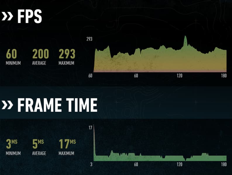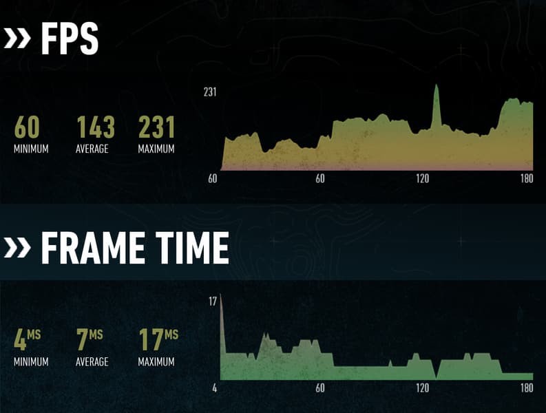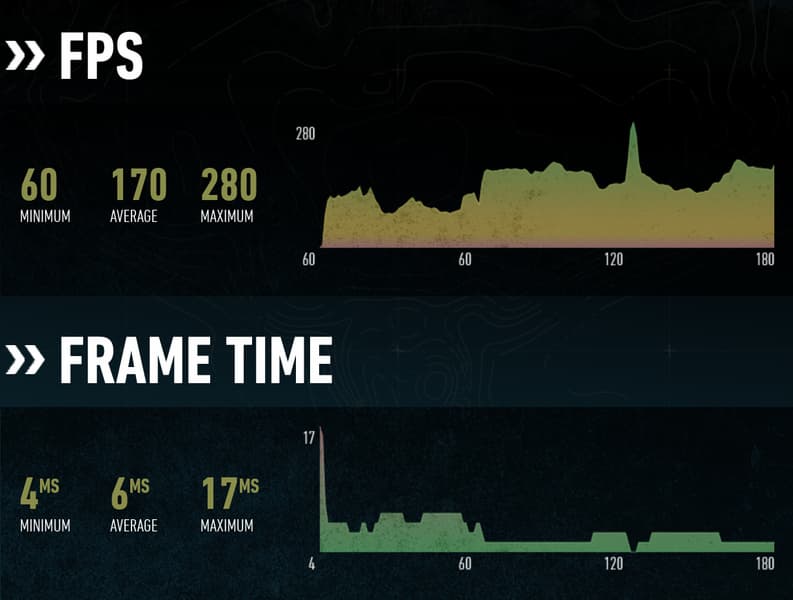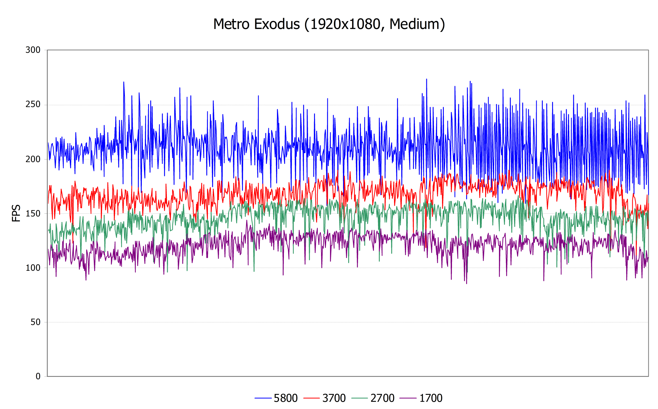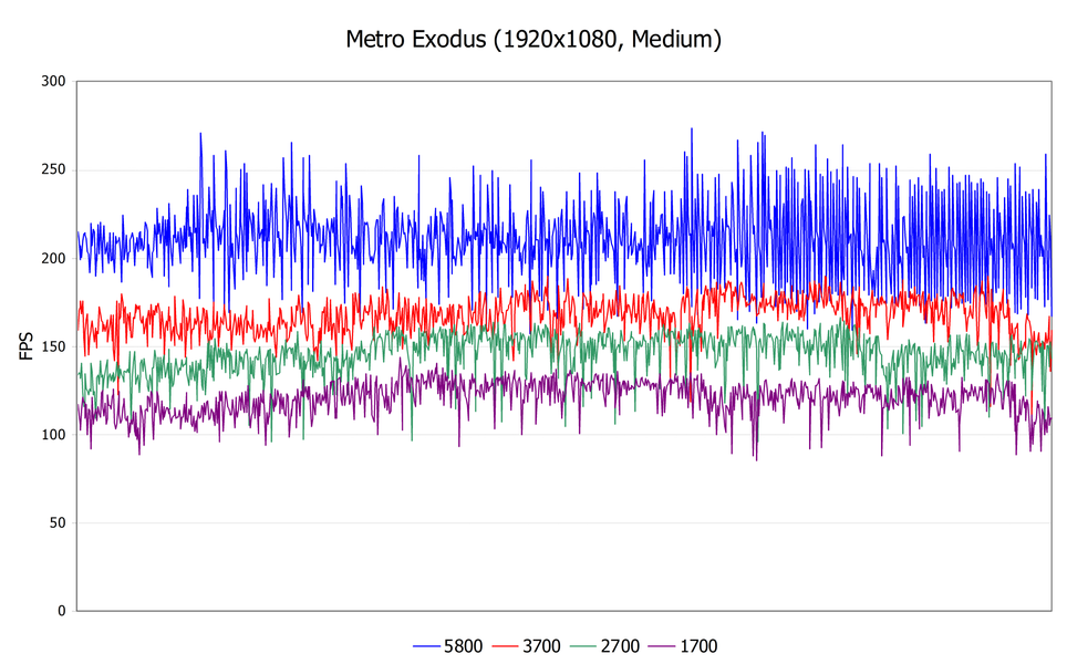 Рассмотрим еще три игры при средних настройках в Full HD-разрешении, и для начала возьмем игру Metro Exodus и нескольких секунд игрового процесса — на основании данных от игры мы строим уже собственные графики, на которых указана мгновенная частота кадров (те же времена рендеринга кадров, по сути).