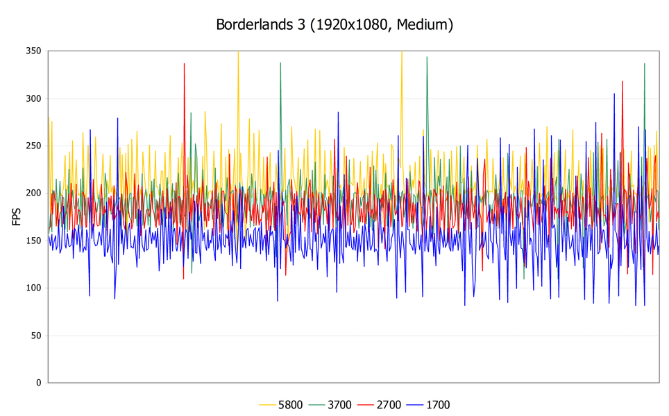 Единственное негативное, что мы отметили — с ростом частоты кадров растет и разброс FPS. Особенно в случае современной модели Ryzen 7 5800X частота кадров «пляшет» вверх-вниз заметно больше. Вряд ли при таких высоких показателях FPS это будет заметно, но все же может вызвать неплавность видеоряда. Но в целом, архитектурный прогресс Zen показан наглядно. Переходим ко второму примеру игры — Borderlands 3 в тех же самых условиях средних графических настроек и Full HD-разрешения на маленьком отрезке в несколько секунд длиной.