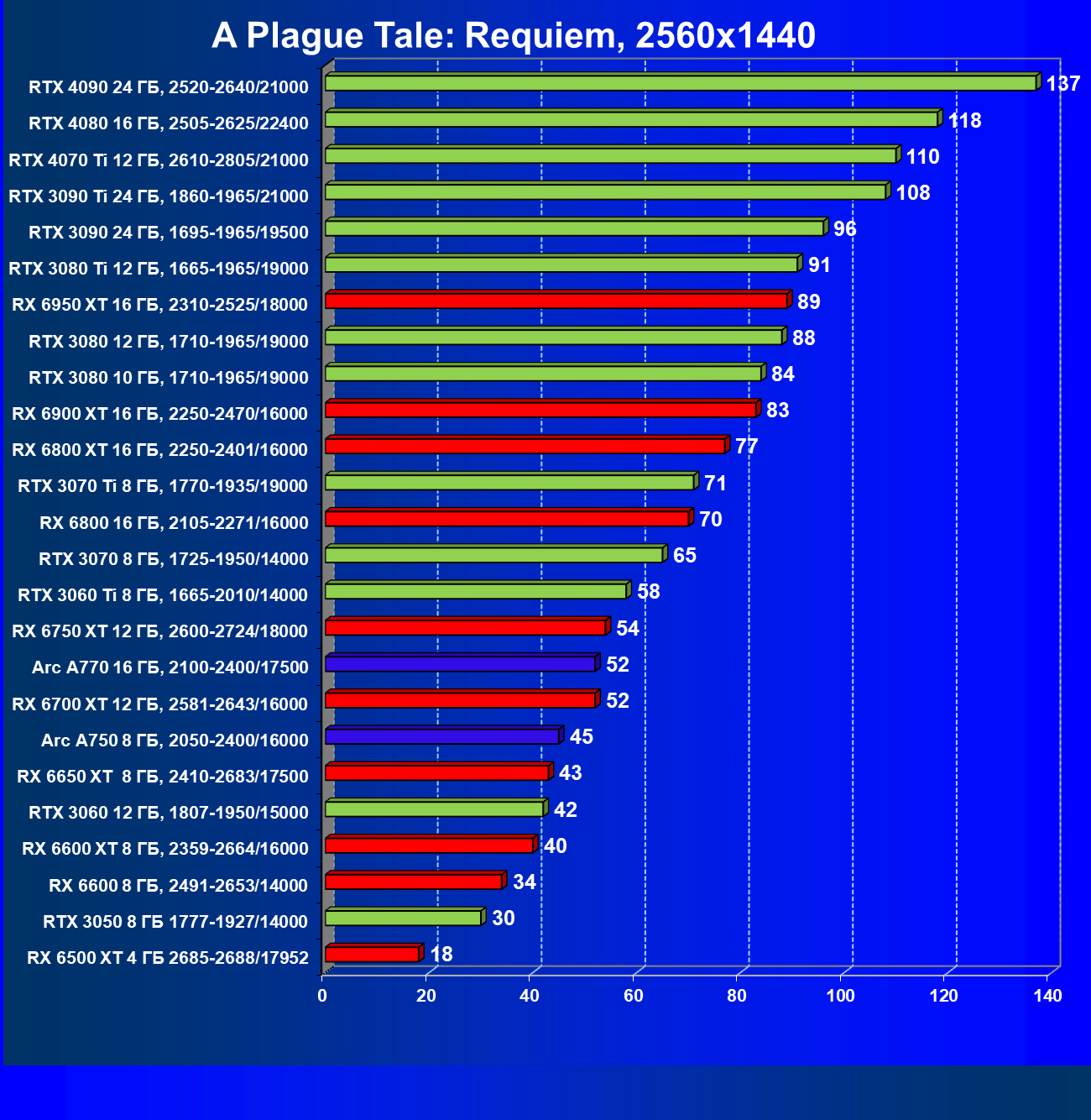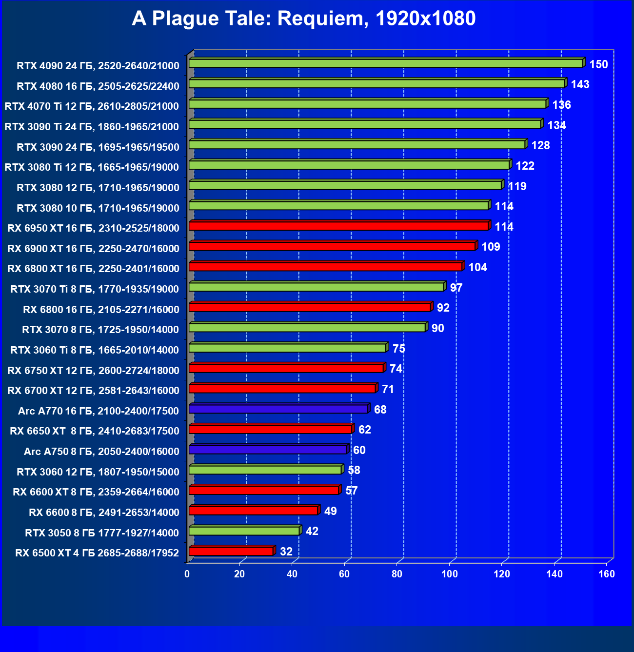 В разрешении Full HD вполне приемлемый уровень производительности демонстрируют видеокарты GeForce RTX 3060, Radeon RX 6600 XT и Intel Arc 750/770. В разрешении 2.5K достаточную производительность обеспечат GeForce RTX 3060 Ti и Radeon RX 6750 XT. В разрешении 4К для комфорта потребуется GeForce RTX 3080 Ti, и то лучше с включением DLSS, иначе FPS местами проседает. Для гарантированного комфорта в 4K лучше использовать GeForce RTX 3090 Ti или GeForce RTX 4070 Ti.