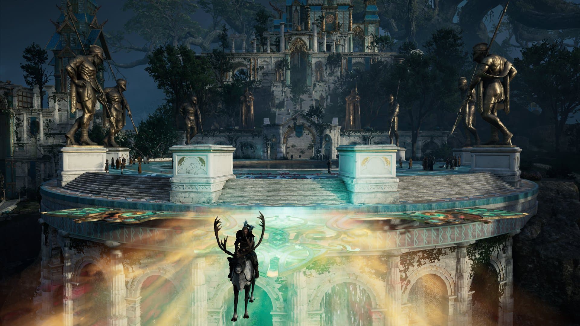 Игра демонстрирует потрясающие виды, если взобраться на высокие крыши соборов, однако нужна куча времени, чтобы все исследовать. Вообще, забраться можно почти на все, что душе угодно — на деревья (даже на божественные), на высокие укрепления крепости, на скалу. Периодически мы обращаемся за помощью к ворону Сюнин, чтобы рассмотреть прилегающие окрестности. Карта и ее обитатели достаточно разнообразны, в каких-то регионах вас встречают с пиром, а где-то не оставляют выбора: только сражение, на смерть.