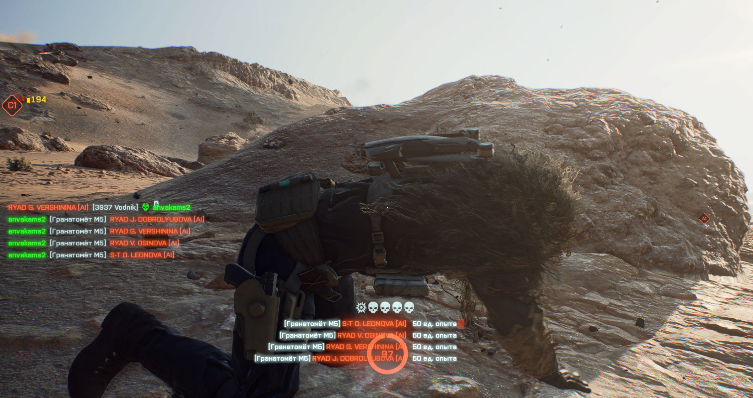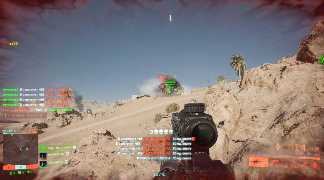 Если в данной игре сбивают с ног, то помощи ожидать не стоит, лучше добить себя и стартовать по новой (восстать как феникс из пепла), ведь другие игроки заинтересованы только в том, чтобы бегать и стрелять. При этом они осознают, что если сами окажутся в таком положении, то маловероятно, что их кто-то выручит и поможет продолжить бой. На скриншоте ситуация, когда мой персонаж погиб первым, но гранатомет выполнил поставленную задачу, и лежа за камнем, я сполна ощутил уничтожение танка с четырьмя противниками.