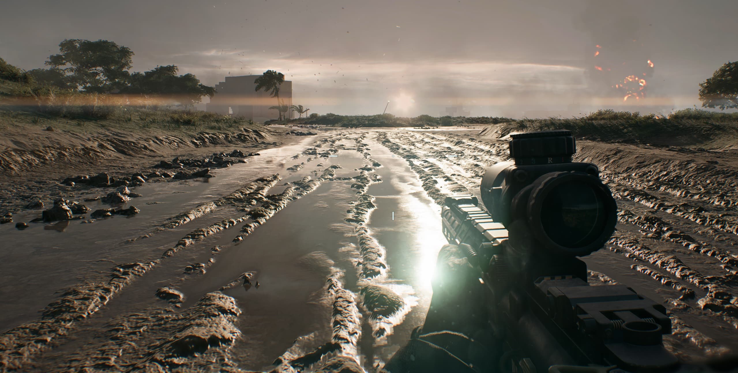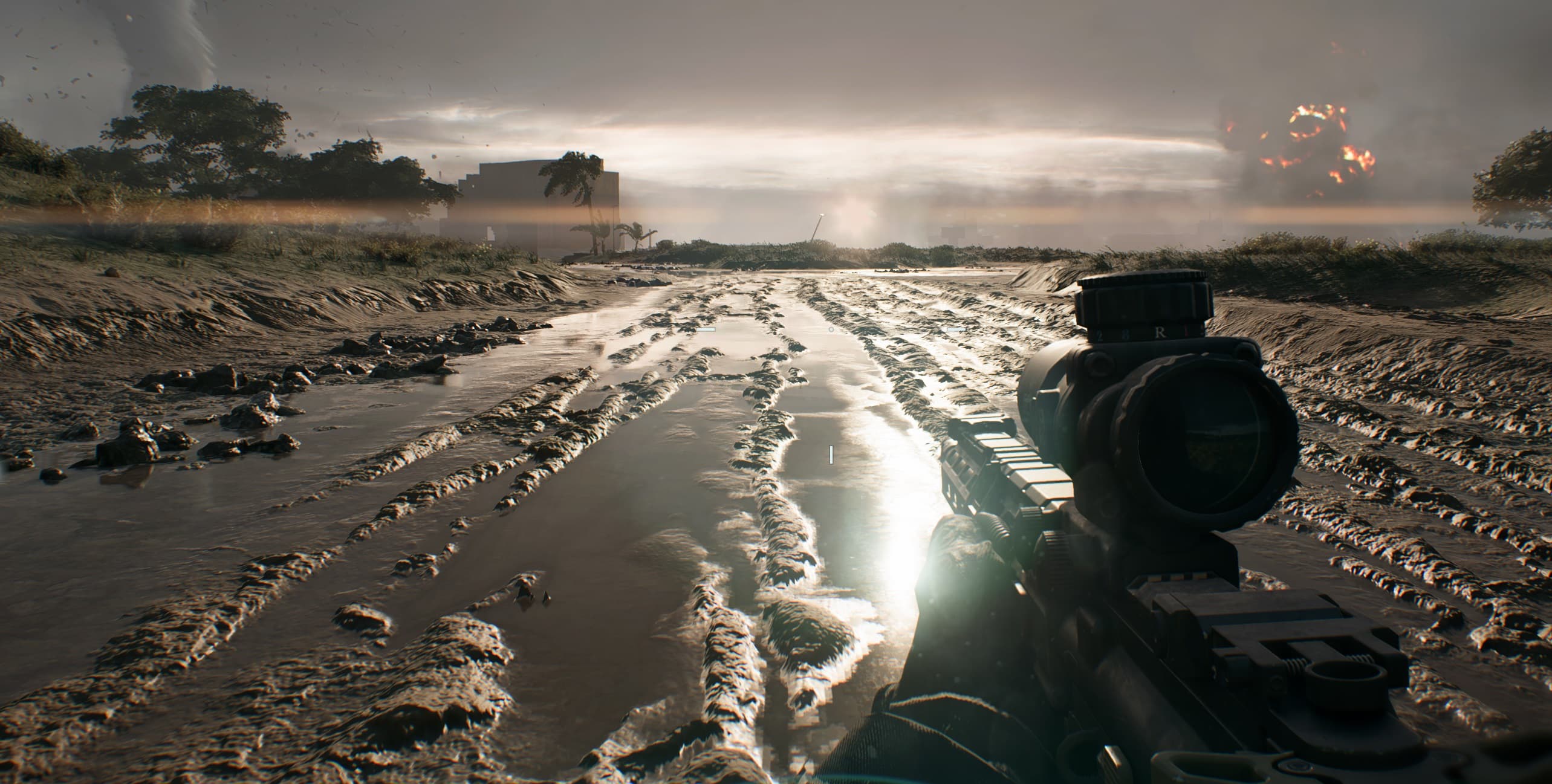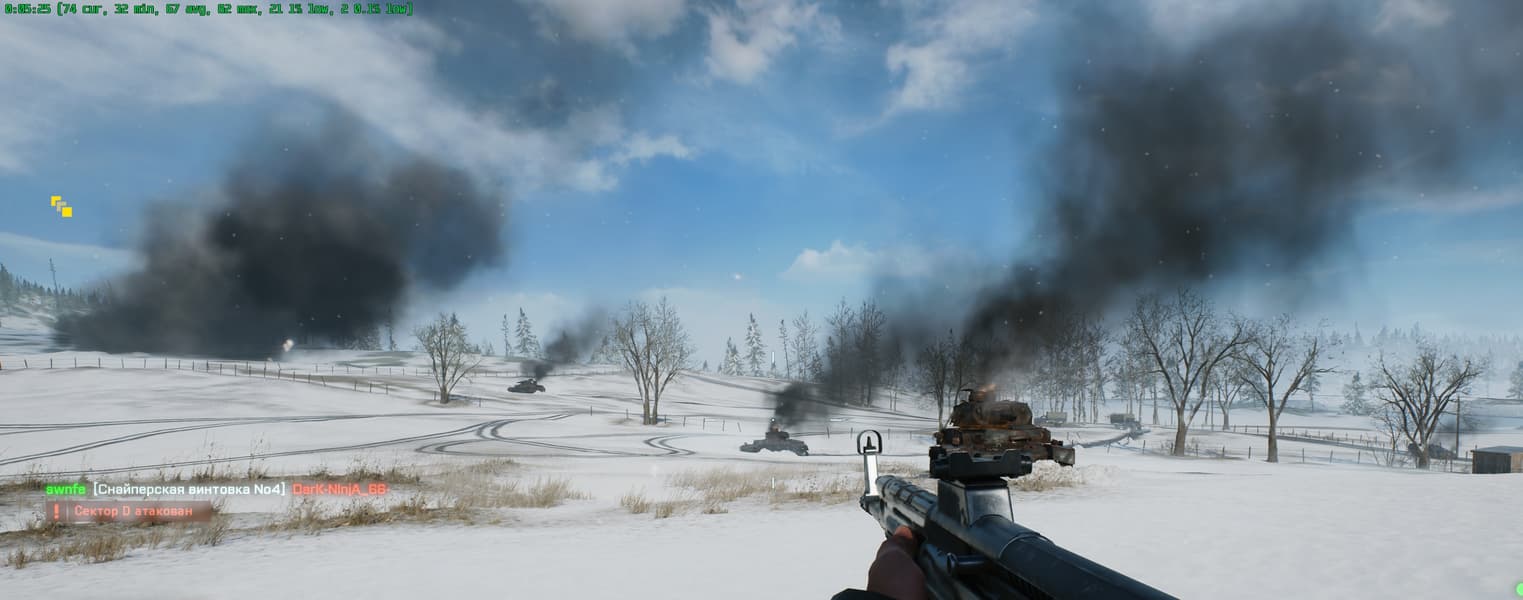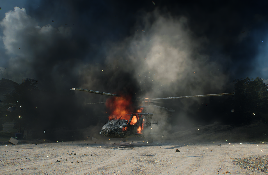Хочу сразу отметить, что в Battlefield 2042 имеется поддержка трассировки лучей (RT), однако существенного изменения графики с включением этой технологии ожидать не стоит, поэтому играя на старых или младших видеокартах, вы теряете не так уж много. Игра хорошо оптимизирована, и в местах, где требуется детальная прорисовка для реалистичности, эта реалистичность вполне обеспечивается и без трассировки лучей: видны отражения в лужах, дым и огонь от техники и взрывов.