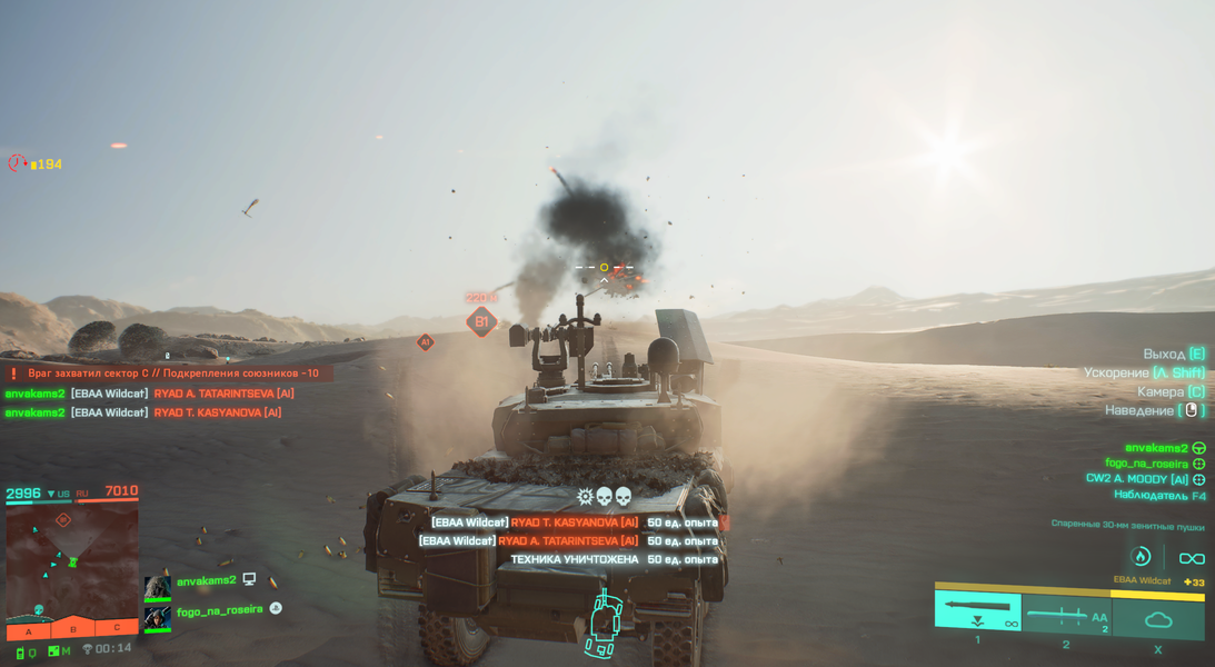 В игре представлена система вызова транспорта. Если вам нужна быстрая транспортировка или если вашему отряду нужна дополнительная огневая мощь, используйте специальное меню, чтобы посмотреть, сможете ли вы получить переброску техники на вашу позицию. Впрочем, я не рекомендую тратить на это время — я старался урвать технику сразу или в процессе игры на «респауне». Приятно, что можно в процессе игры сесть даже в подбитую вражескую технику, и если уйти от огня, то через короткое время идет восстановление техники.