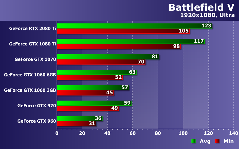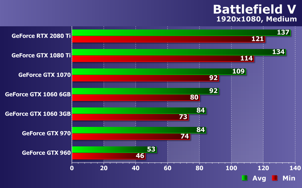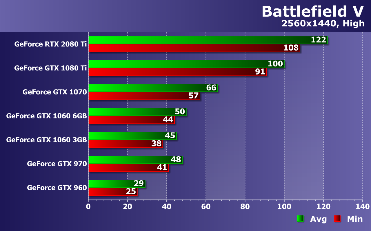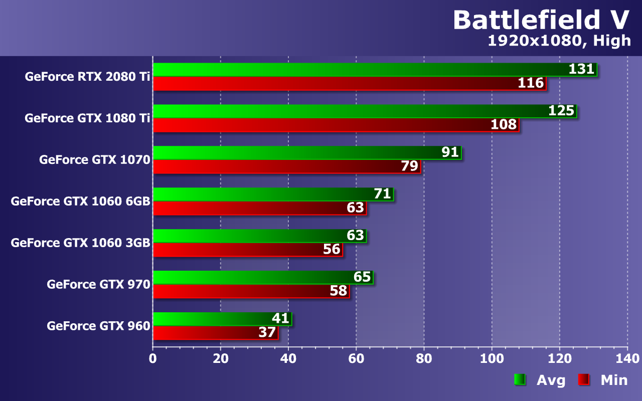 Слабейшая видеокарта в виде GeForce GTX 960 уже без всяких оговорок не справляется с обеспечением даже минимальной играбельности, не дотягивая до 30 FPS даже в среднем. Середнячки же уже не пытаются приблизиться к 60 FPS, но более чем минимально комфортную производительность они обеспечивают. Средней частоты кадров 45—50 FPS при 38—44 FPS как минимум, будет вполне достаточно даже для такой динамичной игры, как Battlefield V.