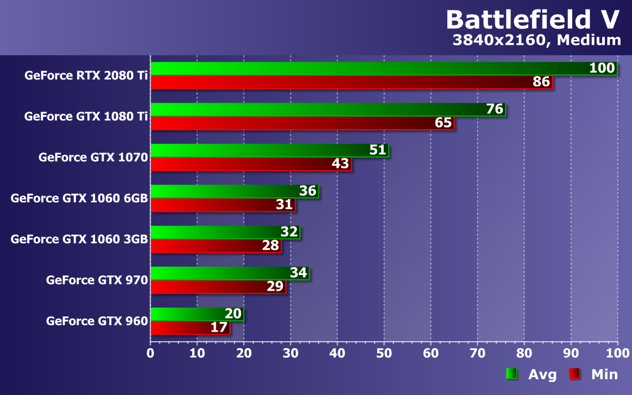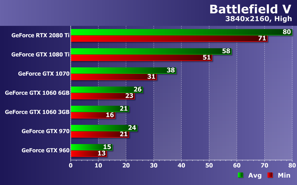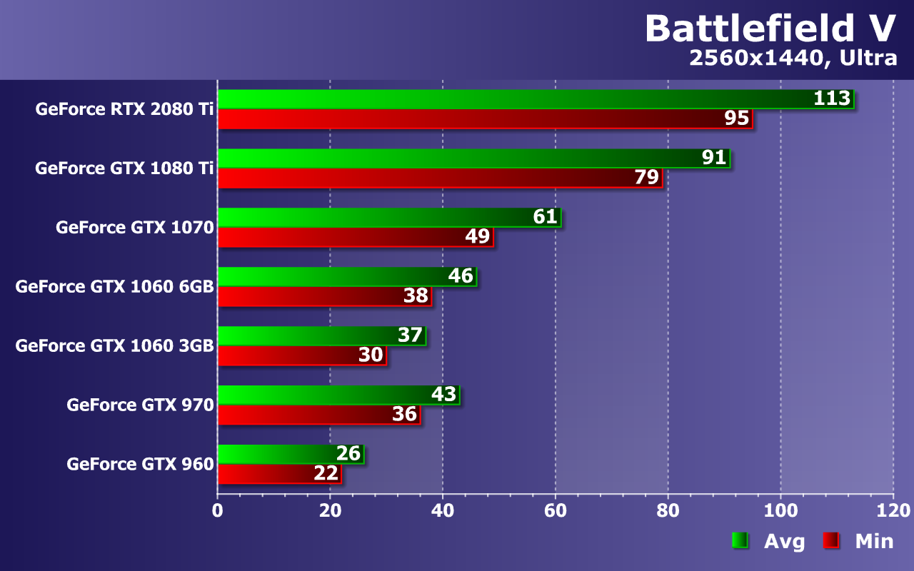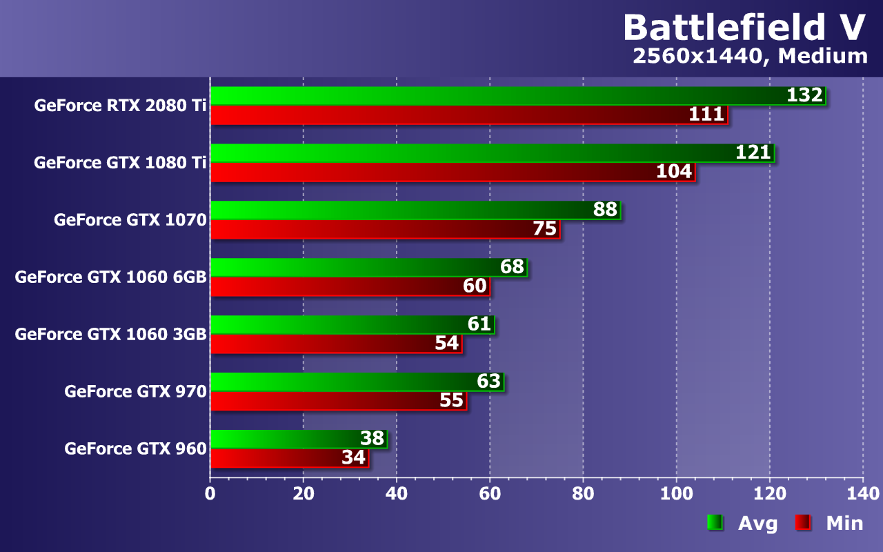Слабейшая видеокарта в виде GeForce GTX 960 уже без всяких оговорок не справляется с обеспечением даже минимальной играбельности, не дотягивая до 30 FPS даже в среднем. Середнячки же уже не пытаются приблизиться к 60 FPS, но более чем минимально комфортную производительность они обеспечивают. Средней частоты кадров 45—50 FPS при 38—44 FPS как минимум, будет вполне достаточно даже для такой динамичной игры, как Battlefield V.