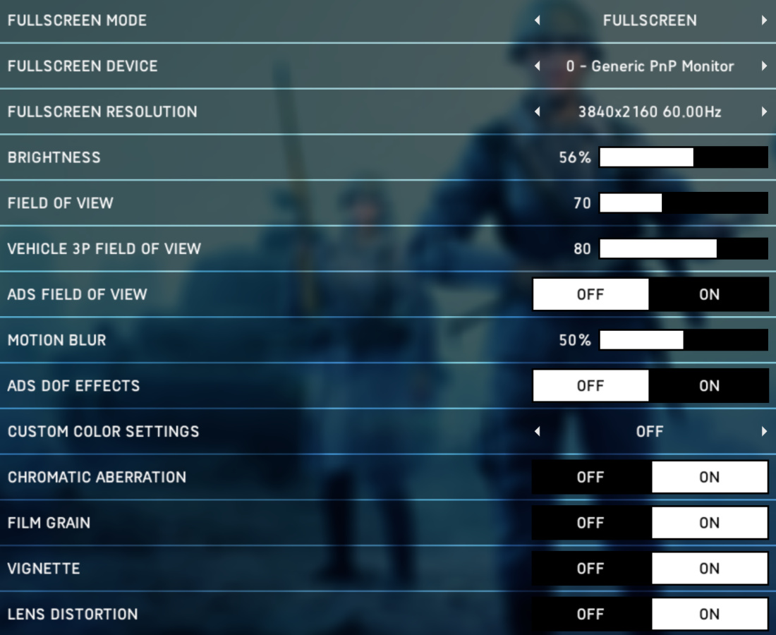 В основном меню настроек изображения Battlefield V можно выбрать монитор, изменить его разрешение, выбрать оконный или полноэкранный режим, изменить яркость и угол обзора. Также здесь включаются и настраиваются некоторые из постэффектов: смазывание в движении, хроматические аберрации, зернистость, виньетирование и геометрические искажения — все они призваны сделать картинку более кинореалистичной и на производительности практически не сказываются. Для игры в многопользовательском режиме их лучше отключить для лучшей видимости, а в сингле — по желанию.