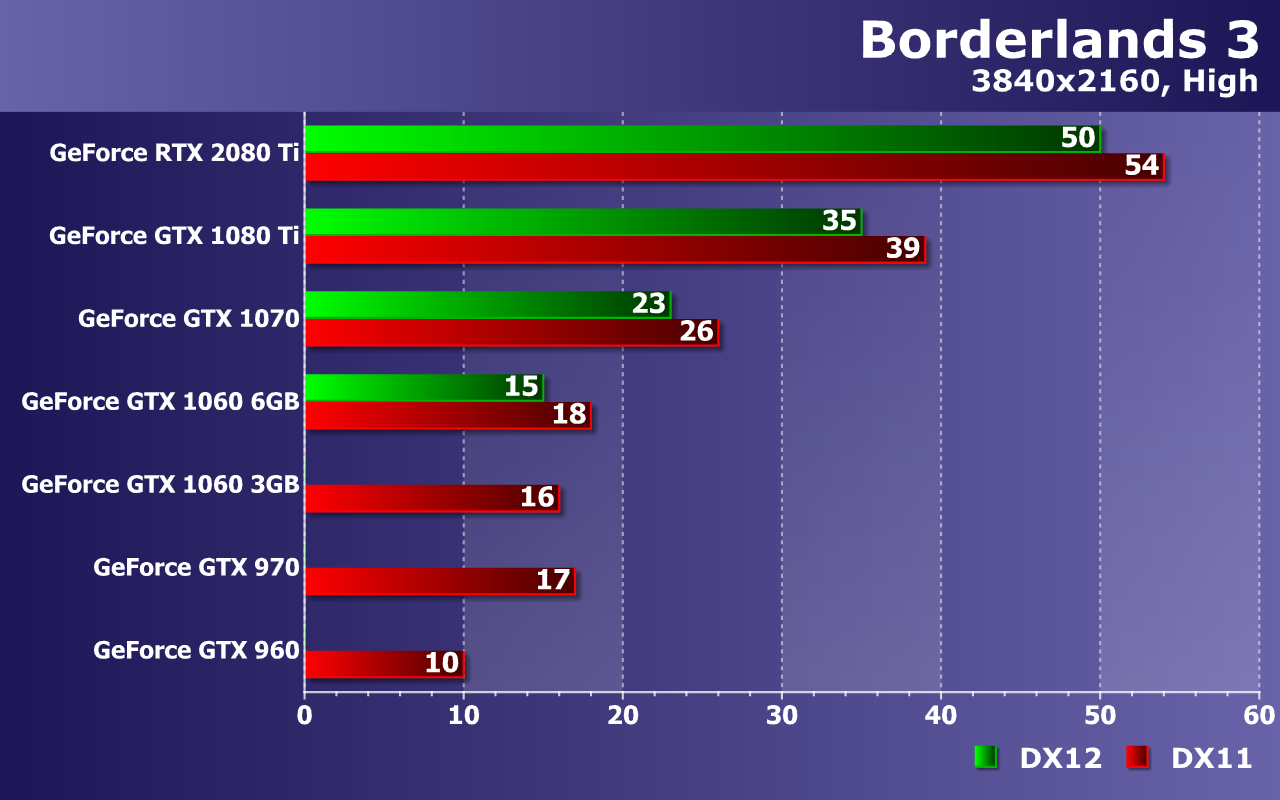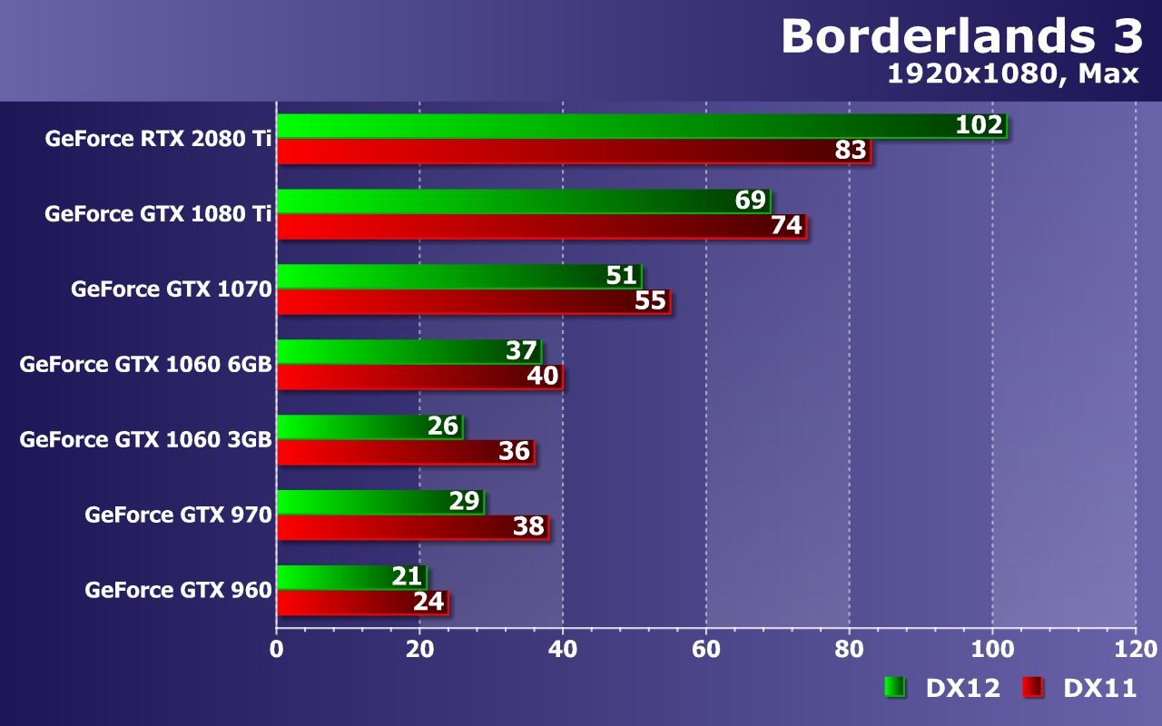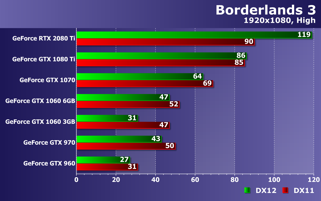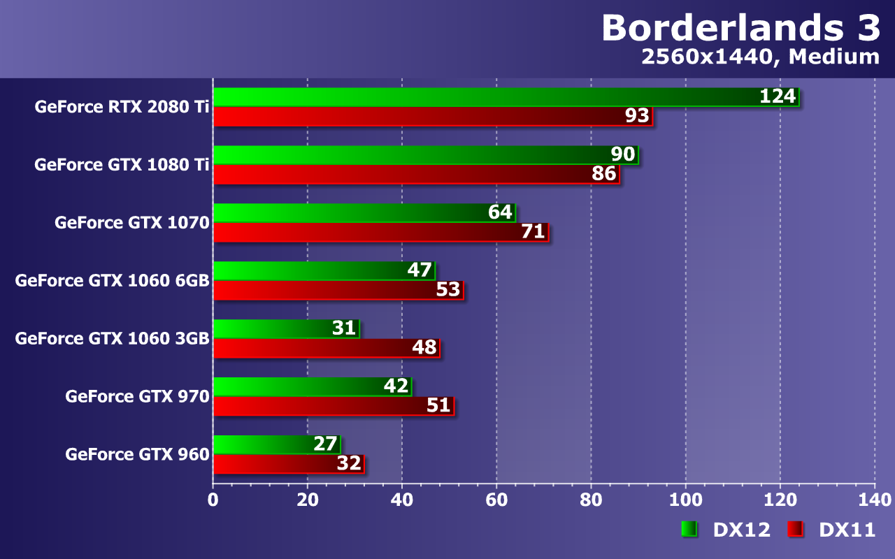 При высочайшем качестве графики в Borderlands 3, с разрешением 2560×1440 уже не справляются все видеокарты до GeForce GTX 1070 включительно! Да, на ней можно снизить несколько настроек и все будет в порядке, но средний показатель частоты кадров в 39 FPS говорит о возможных трудностях с достижением плавности. Кстати, налицо недостаток видеопамяти для DX12 уже не только для GTX 1060 с 3 ГБ памяти, но и для 4 ГБ вариантов.