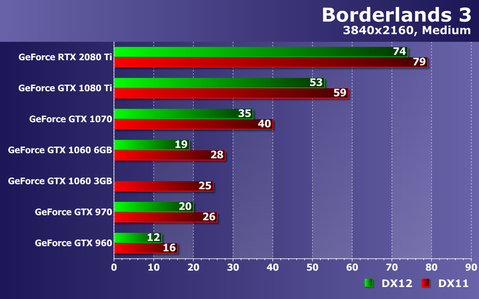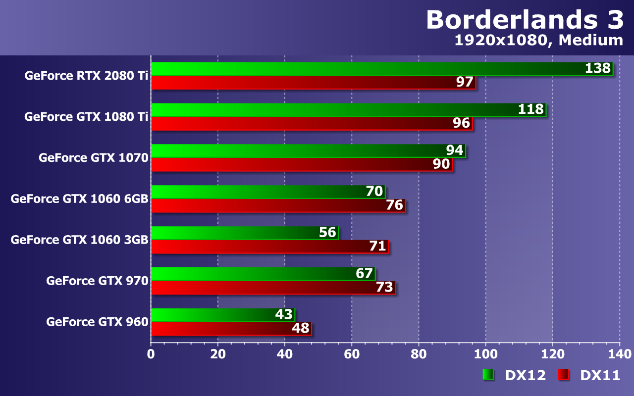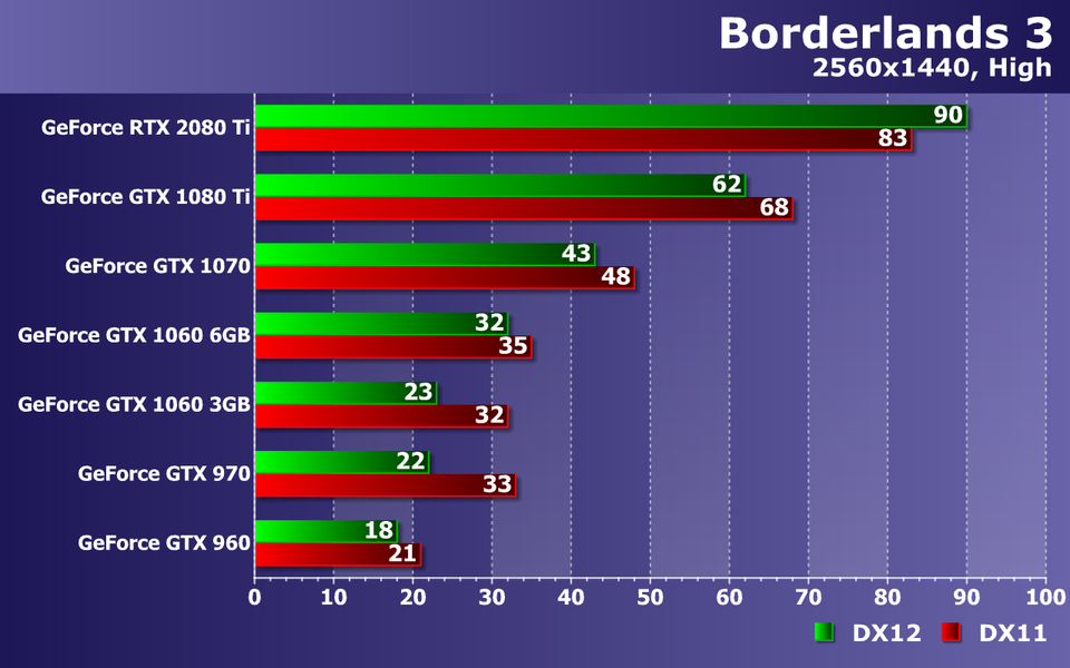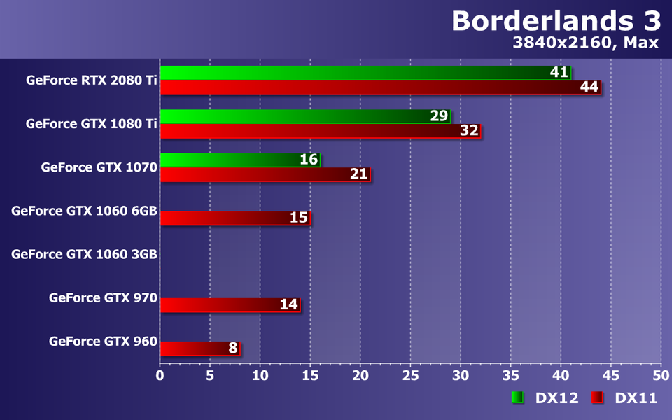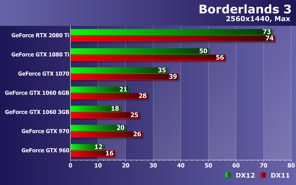 При высочайшем качестве графики в Borderlands 3, с разрешением 2560×1440 уже не справляются все видеокарты до GeForce GTX 1070 включительно! Да, на ней можно снизить несколько настроек и все будет в порядке, но средний показатель частоты кадров в 39 FPS говорит о возможных трудностях с достижением плавности. Кстати, налицо недостаток видеопамяти для DX12 уже не только для GTX 1060 с 3 ГБ памяти, но и для 4 ГБ вариантов.