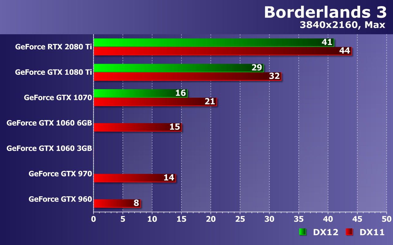 Любителей 4K-разрешения и максимальных настроек графики удовлетворит лишь самый мощный GPU из нашего сравнения. Если даже некогда топовая модель в виде GTX 1080 Ti не дотянула до максимума комфорта, то нынешняя топовая видеокарта GeForce RTX 2080 Ti стала единственной, которая смогла обеспечить хотя бы 44 FPS — частоту кадров для обеспечения лишь минимального комфорта! Так что любителям 4K, максимальных настроек и высокой плавности с 60 FPS остается лишь посочувствовать — достичь всего этого в Borderlands 3 на данный момент попросту невозможно.
