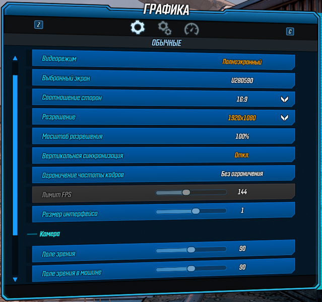На экране Обычных настроек можно выбрать монитор, разрешение и соотношение сторон, режим вывода между привычными оконным и полноэкранным, включить вертикальную синхронизацию и установить ограничитель FPS по желанию. Можно также выбрать поле зрения от 70 до 110 градусов. Но самое главное — можно менять масштаб разрешения от 50% до 200% с шагом в 25%. Таким образом можно или увеличить производительность, выбрав меньшее значение, или улучшить качество сглаживания, выбрав более 100%.