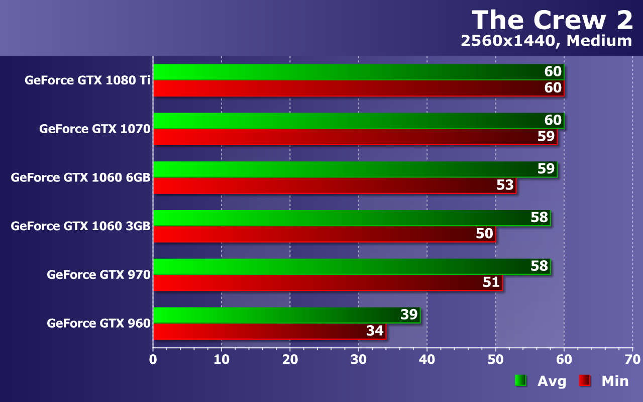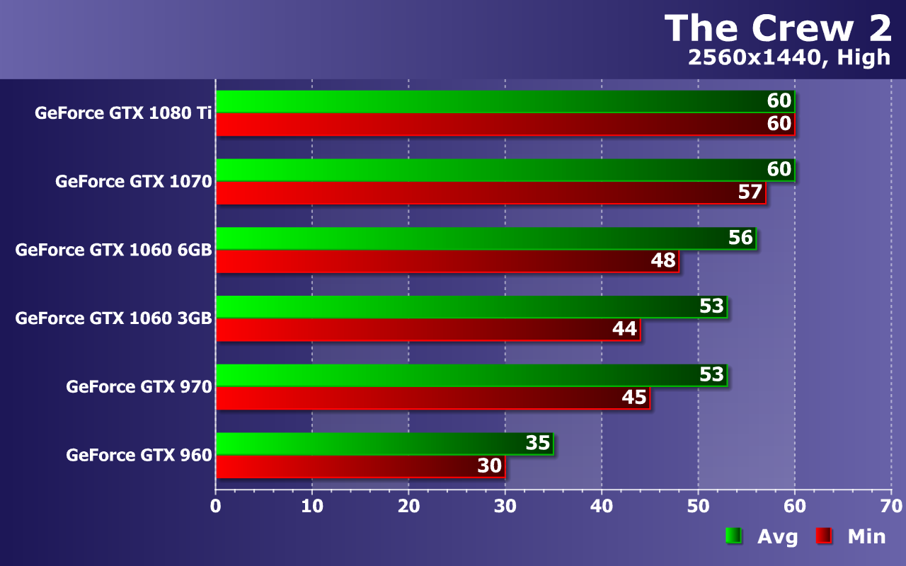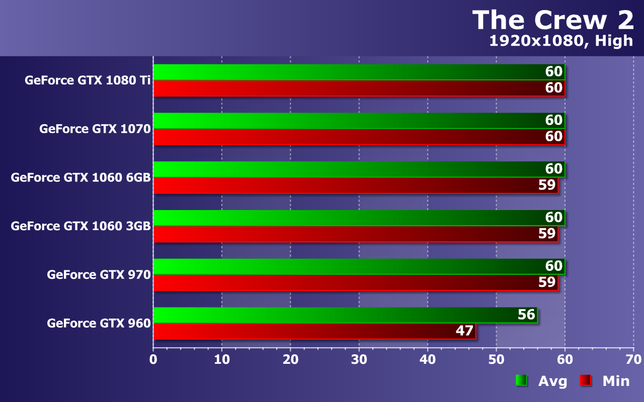 Мы измеряем в тестах не только среднюю, но и минимальную частоту кадров, так как от нее зависит стабильность видеоряда и общий комфорт для игрока. По средней и минимальной частоте кадров из теста можно сделать выводы об общей плавности и комфортности. По нашим наблюдениям, игре The Crew 2 очень сильно вредят падения частоты кадров ниже 30 FPS. Так что для хоть какого-то комфорта при игре жизненно необходимо, чтобы частота кадров оставалась в промежутке между 30 и 60 FPS (выше не подняться, а ниже будет некомфортно). А в идеале — постоянные 60 FPS без снижения вообще.