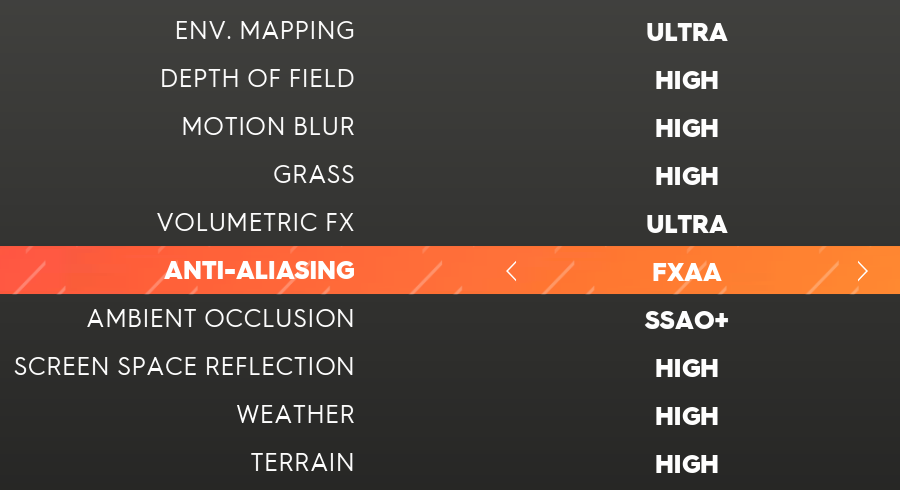 Anti-Aliasing — возможность включения полноэкранного сглаживания алгоритмом FXAA (Fast approXimate Anti-Aliasing). Как мы уже отмечали, других техник сглаживания игра не поддерживает. FXAA — это нетребовательная к мощности GPU техника постобработки, имеющая неидеальное качество. Но свои 3%-4% прироста к скорости ее отключением получить можно.