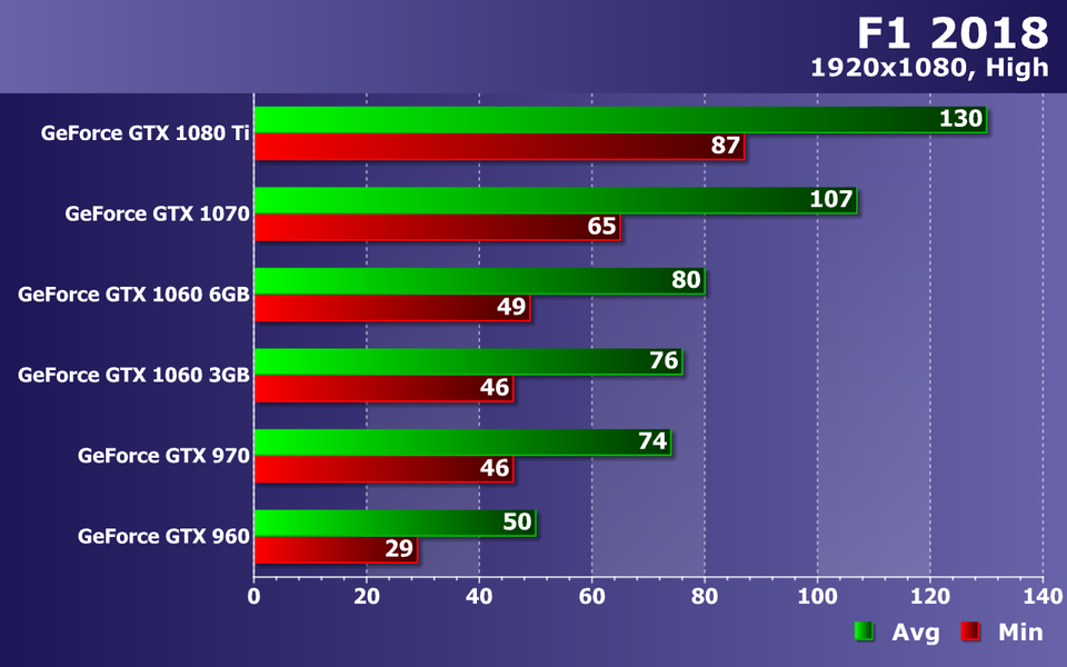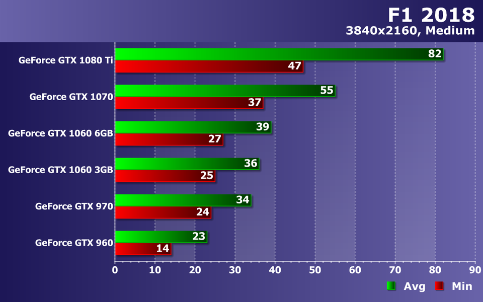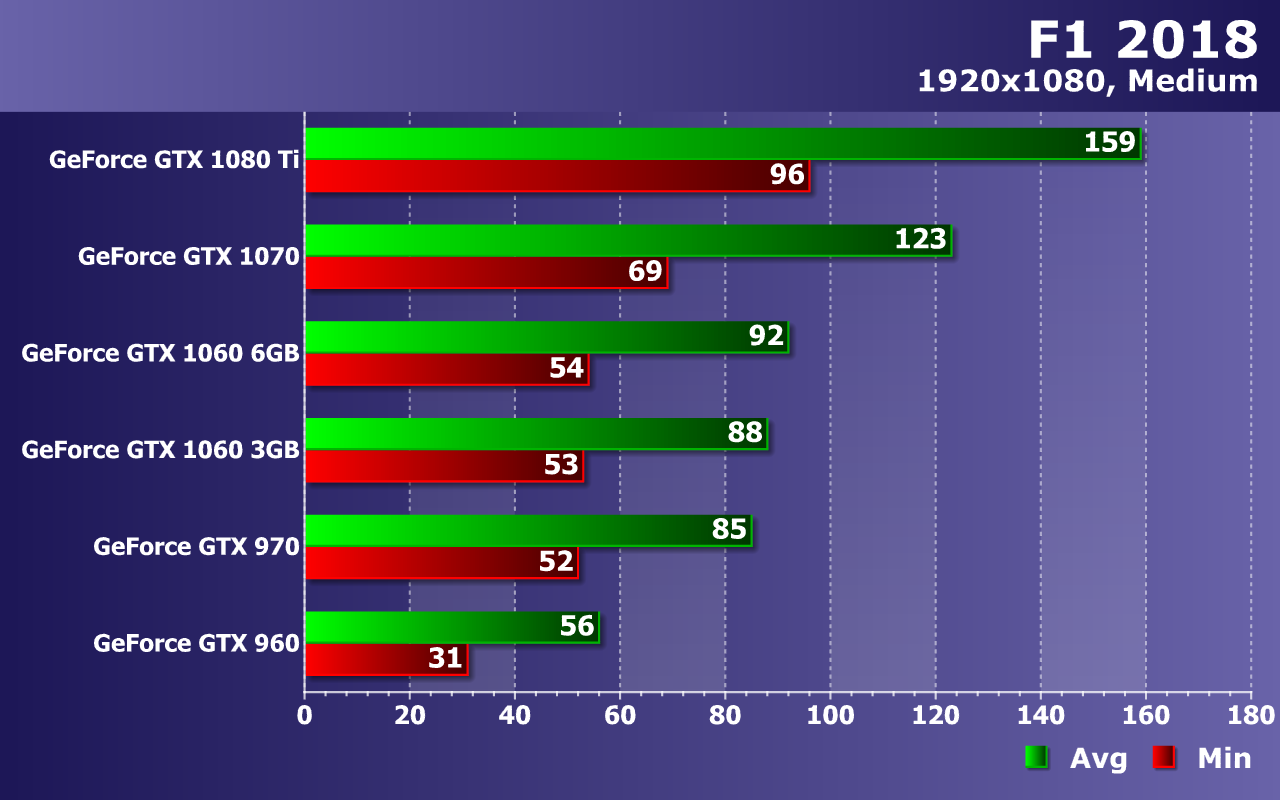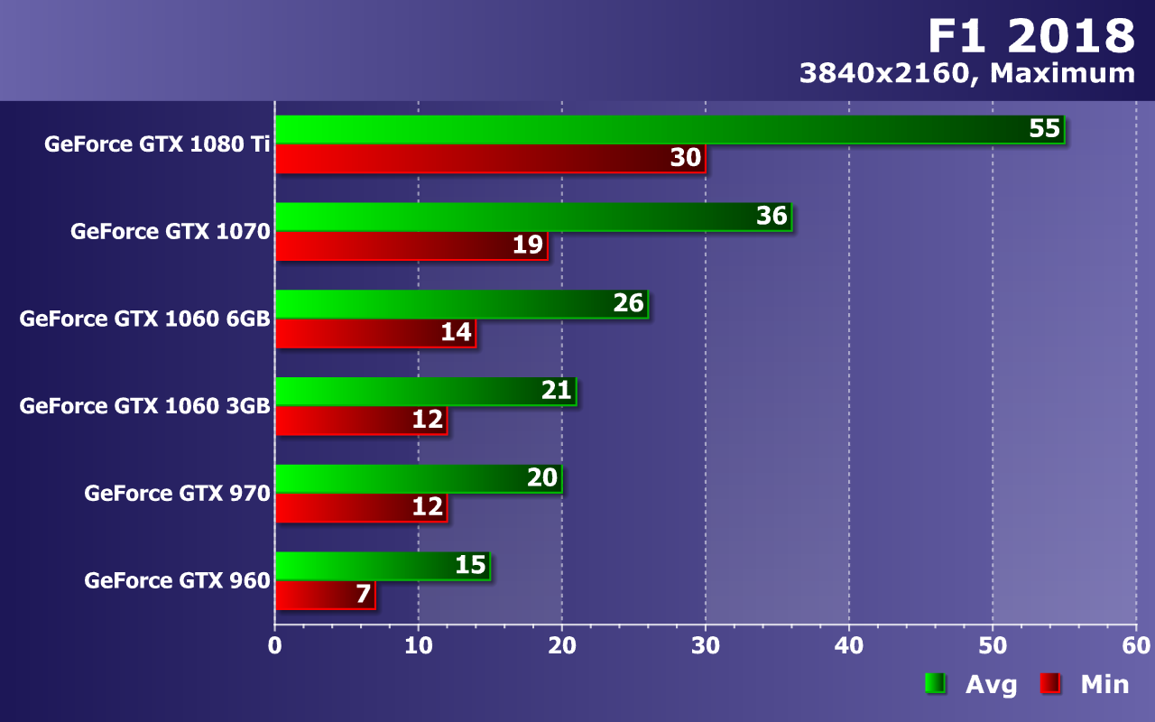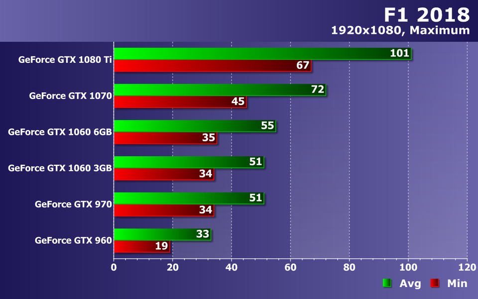 А вот максимальные настройки графики в F1 2018 подкосили производительность GeForce GTX 960 ниже минимально допустимого порога. Играть с 33 FPS в среднем при падениях частоты кадров до 19 FPS уже практически невозможно. Средние по мощности GPU из нашего сравнения показали просто комфортную играбельность, не опустившись ниже 51-55 FPS по средней частоте кадров при минимальном значении в 34-35 FPS, что нормально для видеокарт такого уровня.