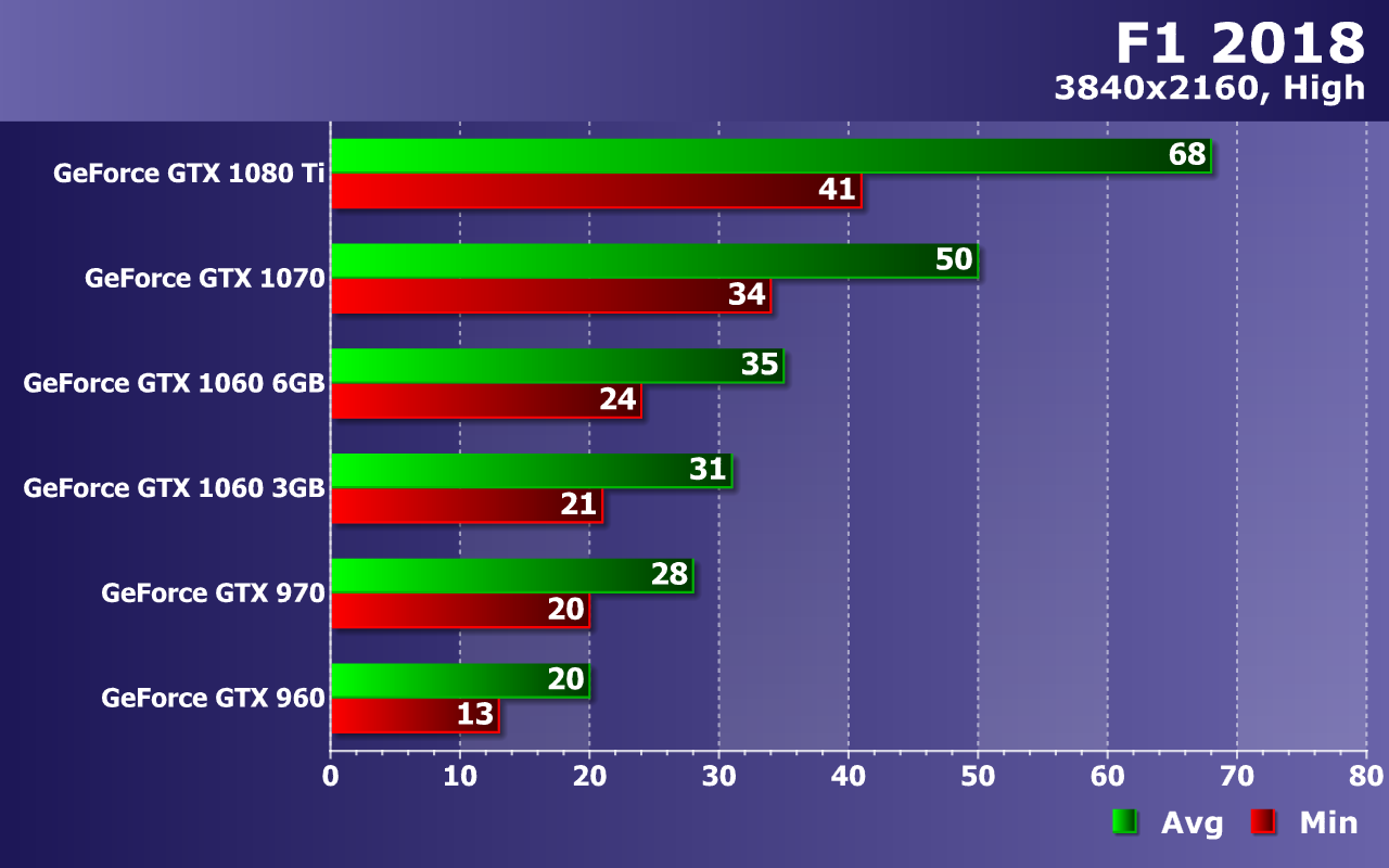 При высоких настройках и 4K-разрешении GeForce GTX 1070 еще обеспечивает минимально достаточный уровень производительности, показывая 50 FPS в среднем при 34 FPS как минимум, но требовательным игрокам с мониторами высокого разрешения лучше подойдет топовая GeForce GTX 1080 Ti, которая показала 68 FPS в среднем при отсутствии падений частоты кадров ниже 41 FPS — относительно неплохой результат.