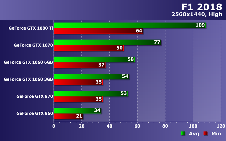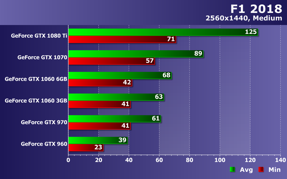 Разрешение 2560×1440 при максимально возможном качестве графики в F1 2018 ставит куда более сложную задачу по обеспечению даже минимального комфорта. С чем справляются только два топовых решения. Видеокарты среднего уровня, показавшие производительность 36-41 FPS в среднем при как минимум 21-24 FPS не дадут поиграть с достаточным комфортом. Поэтому будет лучше снизить несколько графических настроек до просто высоких.