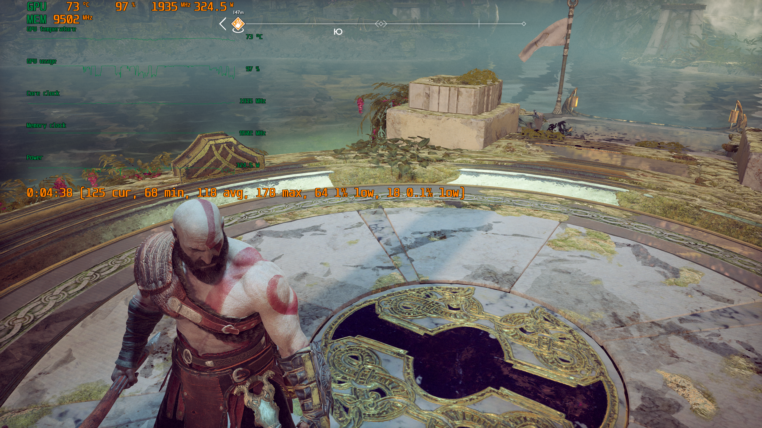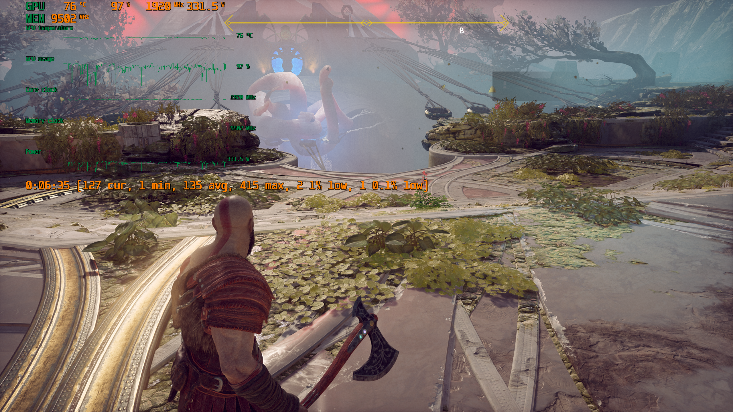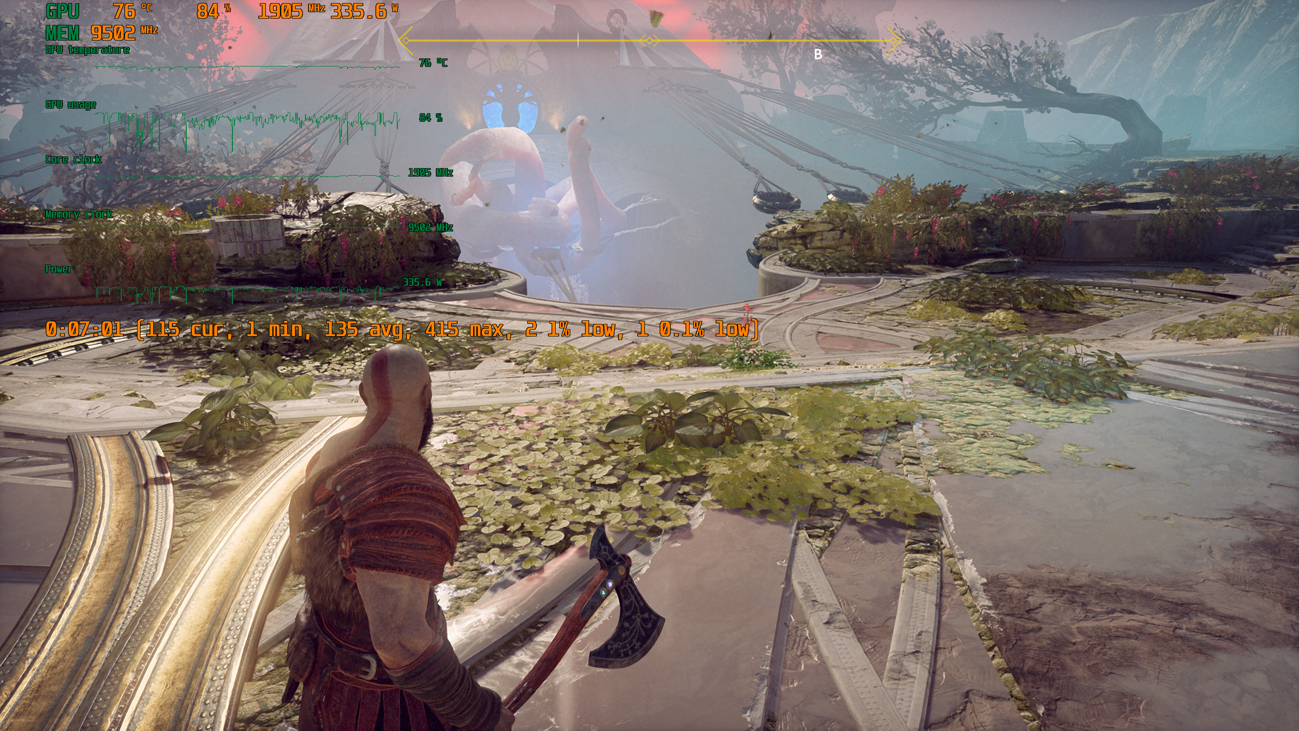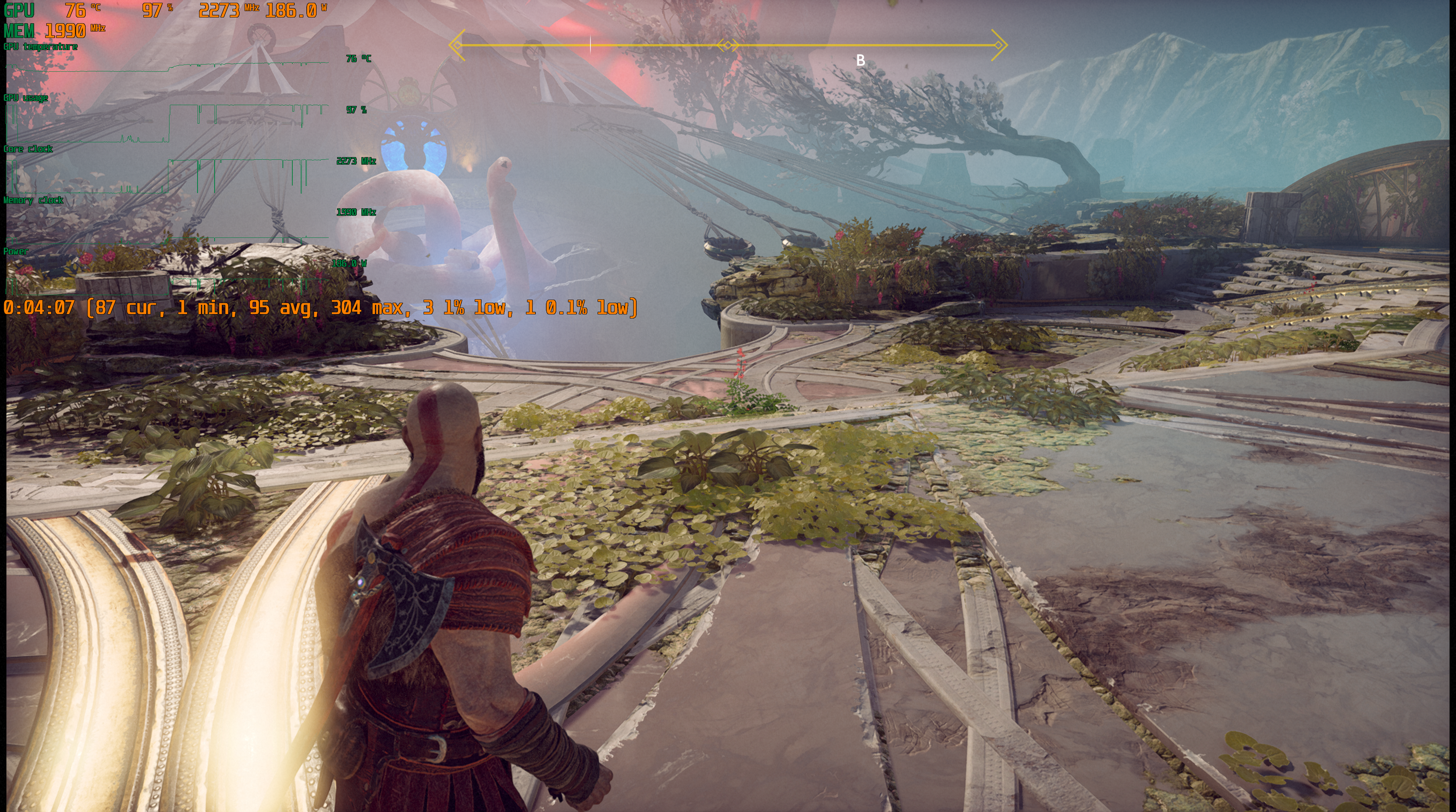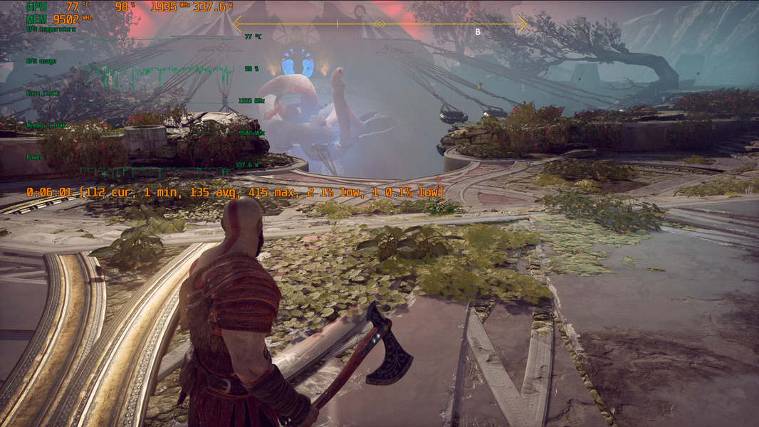 Игра поддерживает технологию Nvidia DLSS, и при использовании графических процессоров семейства GeForce RTX можно запускать God of War в повышенном разрешении, сохраняя высокий FPS. DLSS призвана обеспечивать максимальное качество изображения без ущерба для производительности.