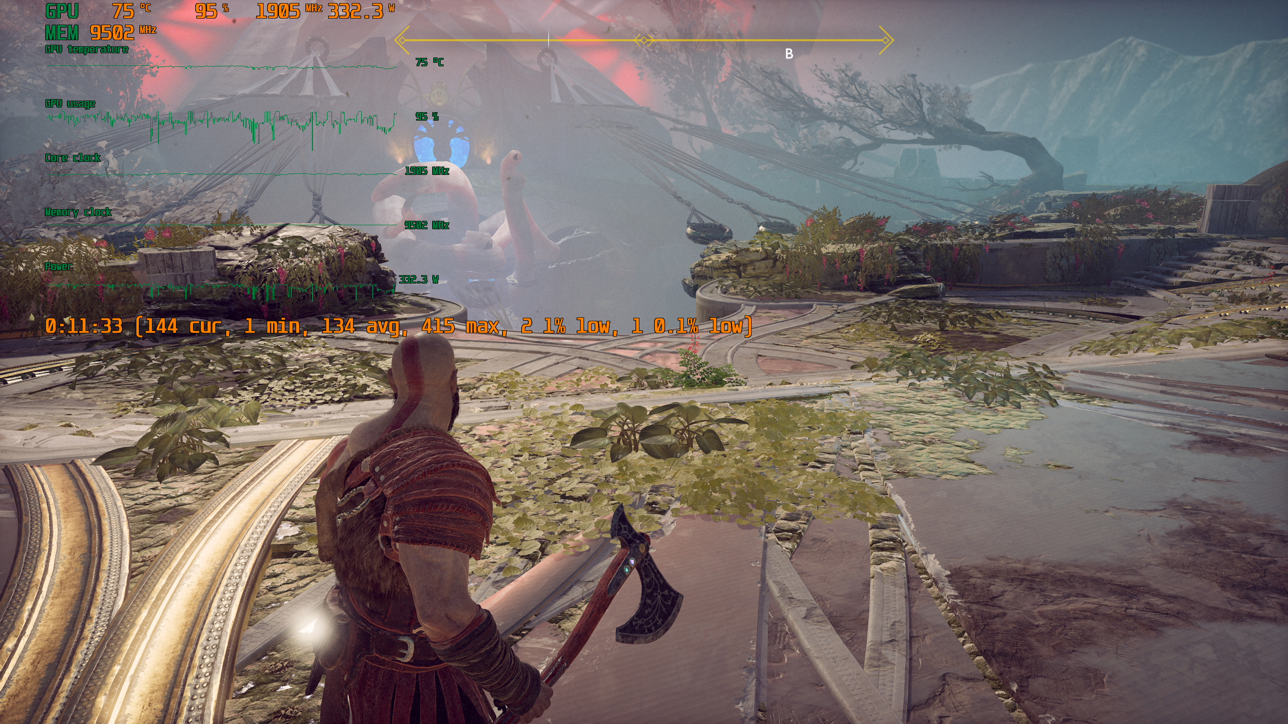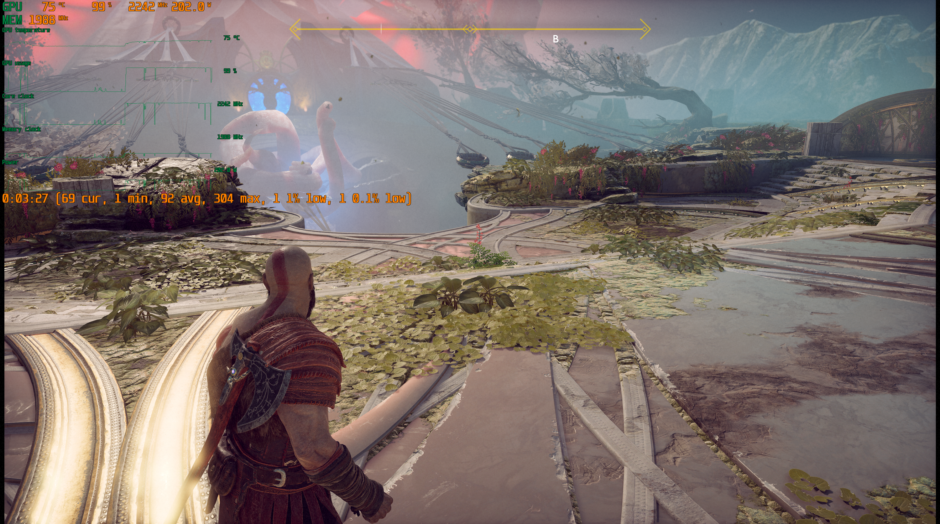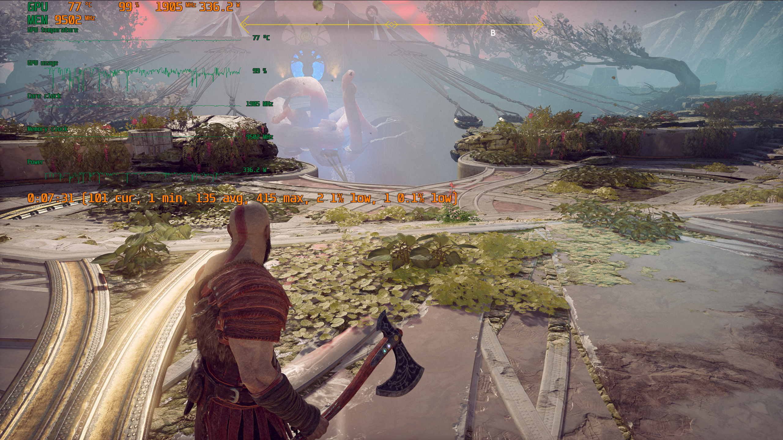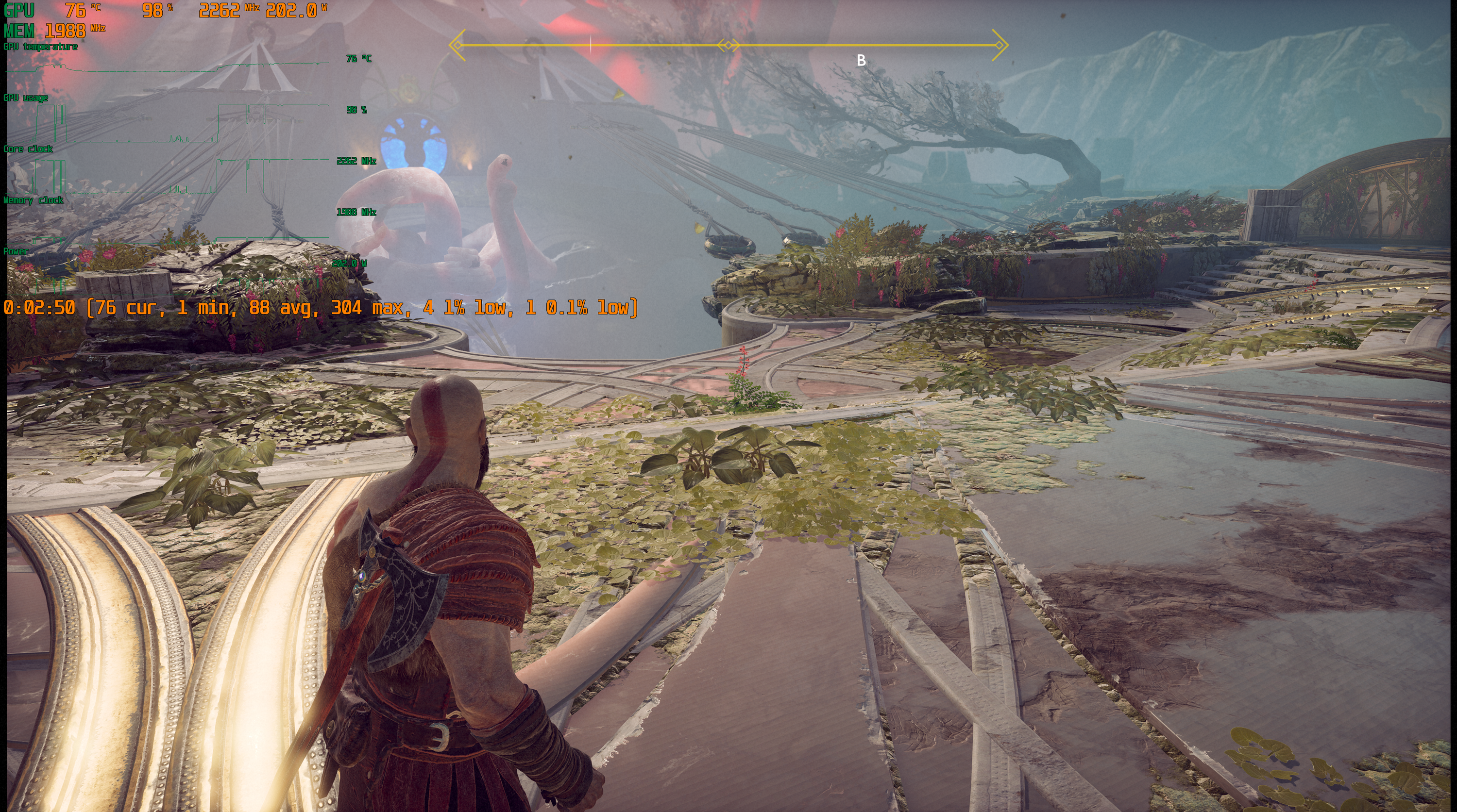 Игра поддерживает технологию Nvidia DLSS, и при использовании графических процессоров семейства GeForce RTX можно запускать God of War в повышенном разрешении, сохраняя высокий FPS. DLSS призвана обеспечивать максимальное качество изображения без ущерба для производительности.