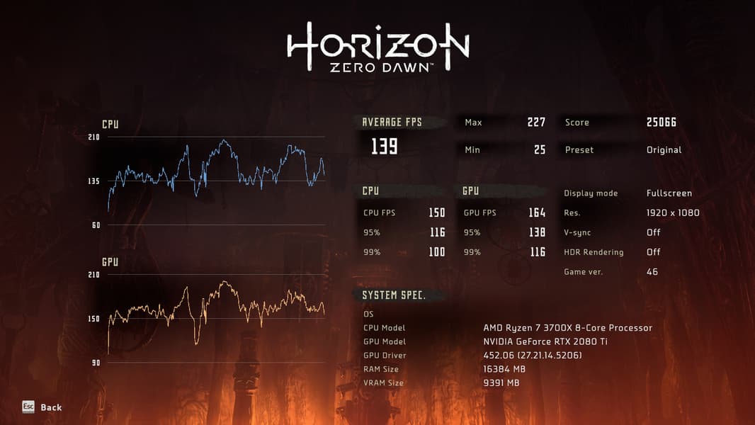К счастью, в игре есть встроенный бенчмарк с облетом городского уровня. Хотя он и показывает схожую производительность с первыми уровнями игры, дальнейшие локации в ней становятся более требовательными, возрастает и сложность мира и количество существ в нем, что сказывается на частоте кадров — зачастую FPS становится ощутимо ниже, чем в бенчмарке. Так что тест неидеален, и показывает результат несколько выше, чем при типичной игре. Хотя обычно делают наоборот — чтобы тест отражал самые сложные моменты игрового процесса.