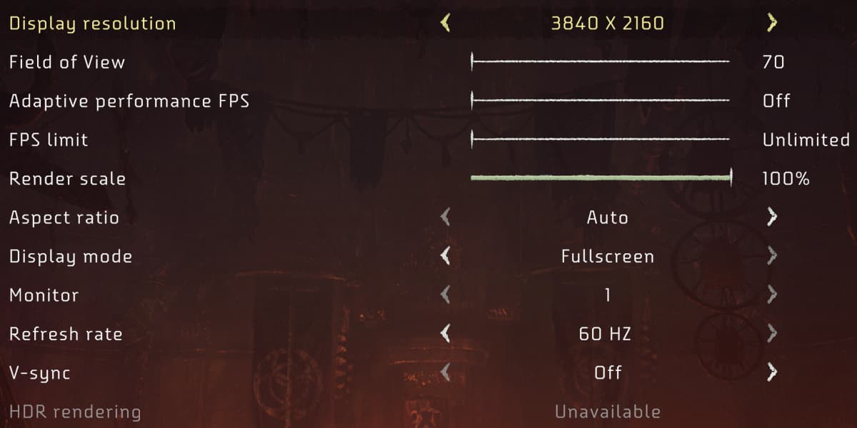 Графические настройки игры разделены на два пункта: Display и Graphics. В первом из них, кроме выбора монитора, разрешения экрана, его частоты обновления и режима вывода (полноэкранный или оконный), можно настроить поле зрения (Field of View) от 70 до 100 градусов (по умолчанию стоит 70, но иногда лучше выбрать 85-90 градусов), а также включить и выключить вертикальную развертку. Есть возможность включения HDR-рендеринга на устройствах с поддержкой технологии.