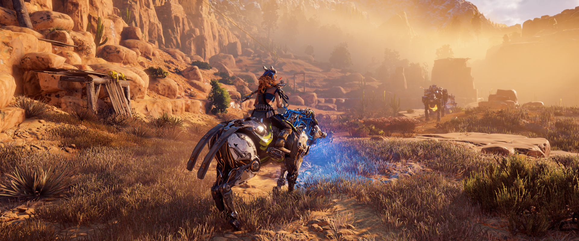 С точки зрения 3D-разработки, специалисты из Guerrilla Games очень неплохо поработали! Например, в Horizon Zero Dawn используется гибридная система освещения, сочетающая предрассчитанное освещение («запеченное») с полностью динамическими источниками света, а несколько режимов дня и ночи могут комбинироваться и сочетаться для создания реалистичного течения времени суток. Это выглядит впечатляюще, но есть и недоработки. В частности, очень похоже, что некоторые анимации выполняются исключительно при 30 FPS и это хорошо заметно при куда более высокой производительности на мощных ПК. Это же касается и физики волос главной героини игры — при высоких значениях FPS разница в плавности бывает заметна.