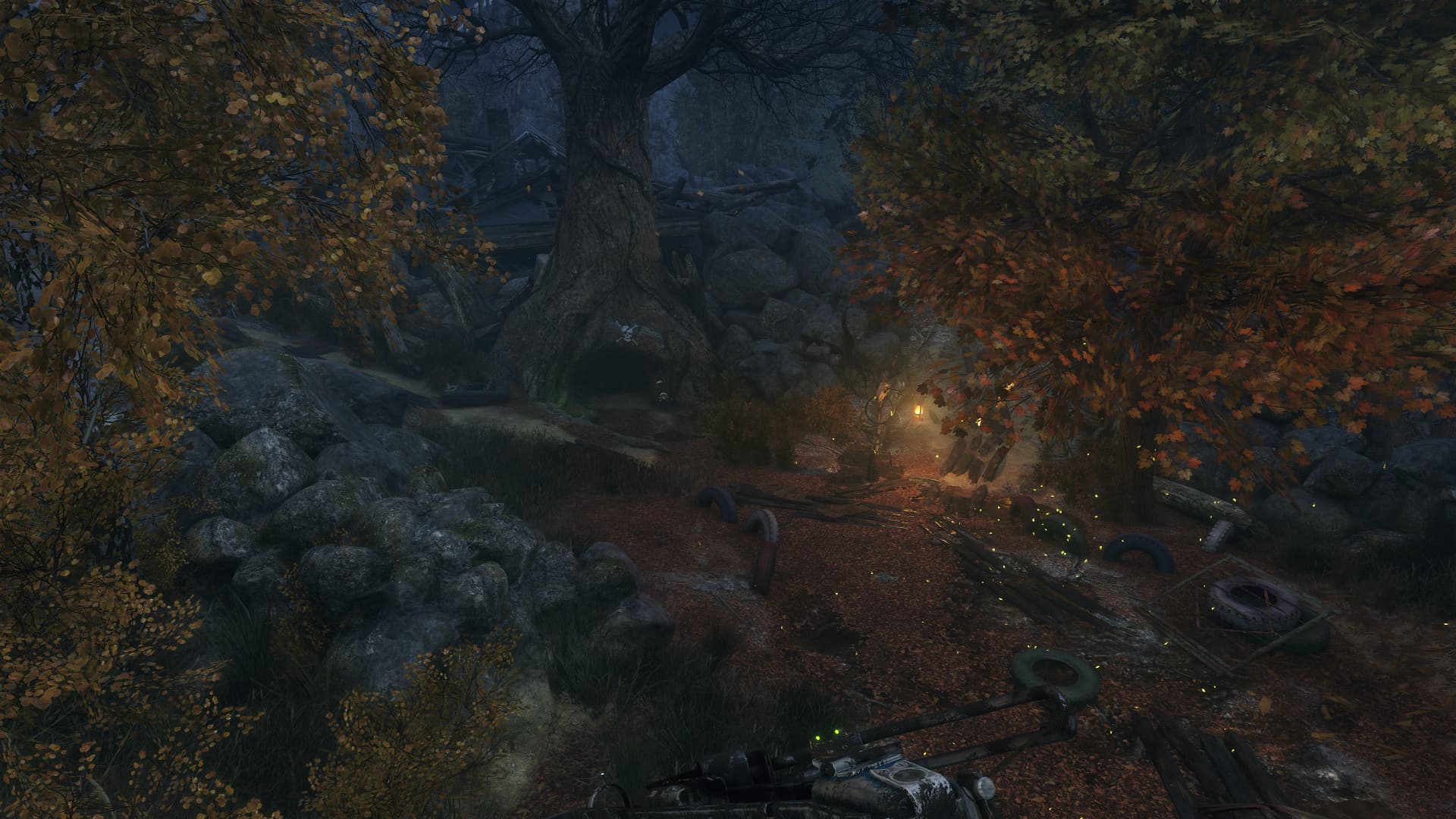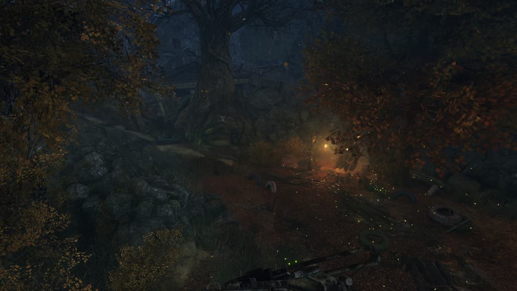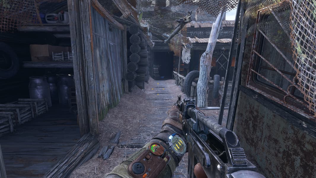 И на этом примере с сочетанием открытого и закрытого пространств можно увидеть явное улучшение картинки. Посмотрите на ящики и бидоны на полу в сарае и бревна сруба правее, стену и крышу по центру, да и вообще практически везде, в отличие от плоских поверхностей без расчета GI, получается объем — полутени именно там, где они и должны быть в реальности. Даже оружие и рука выглядят объемнее и реалистичнее именно с расчетом глобального освещения при помощи трассировки лучей.