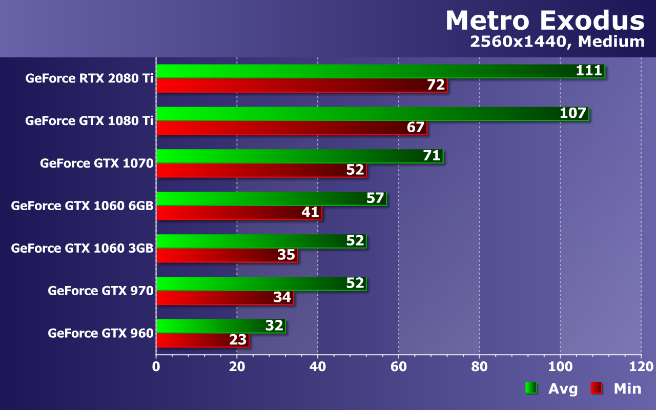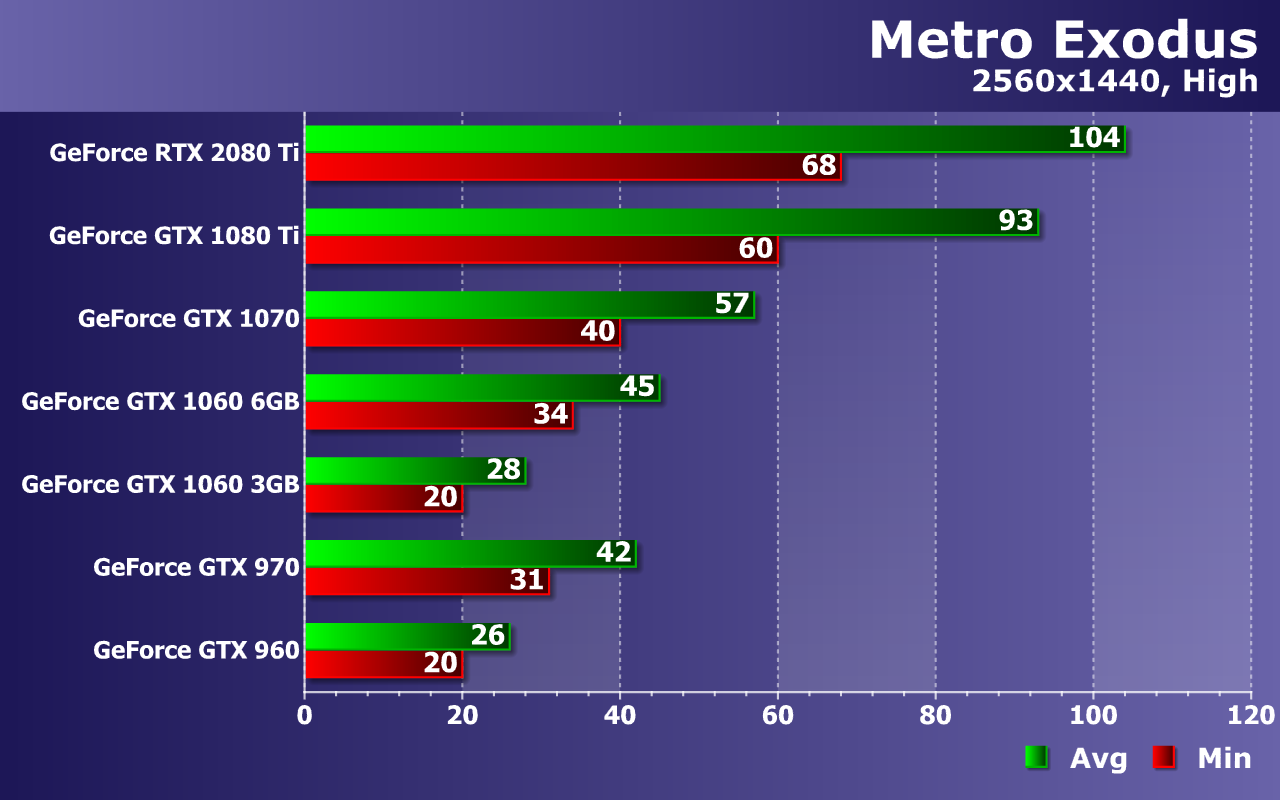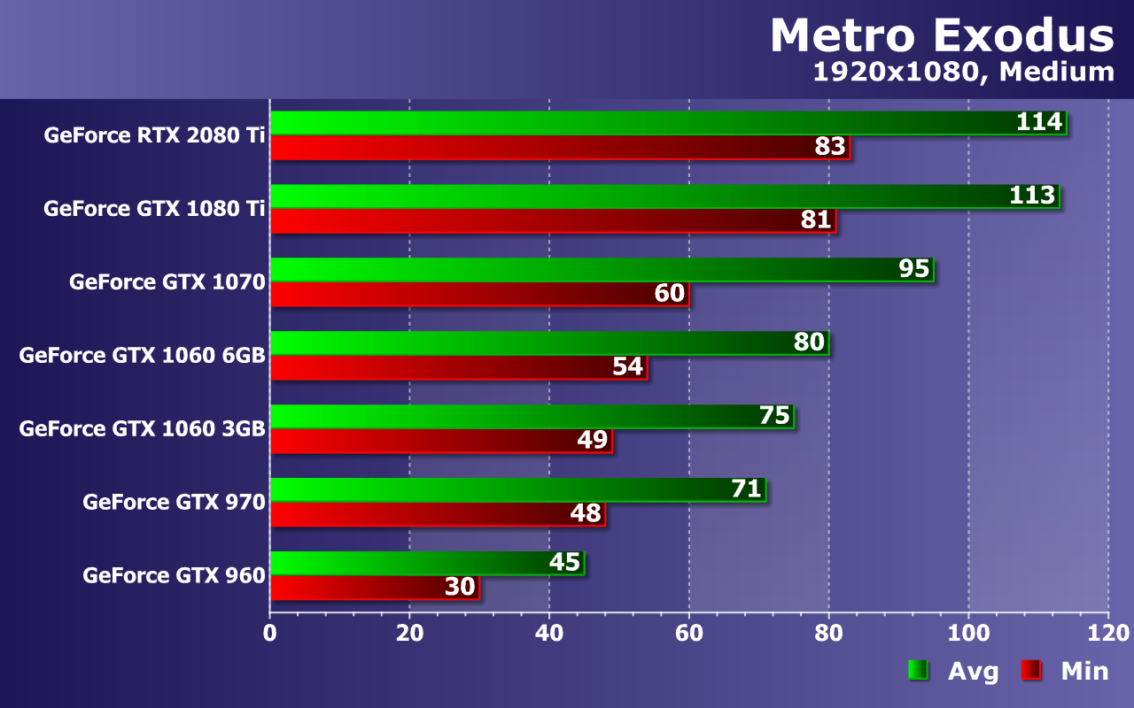 Этого не скажешь про GTX 970 и GTX 1060 6GB — два середнячка близки к 60 FPS, но лишь в среднем. Хотя при 38—42 FPS как минимум и 57—63 FPS в среднем, играть в Metro Exodus в любом случае будет весьма приятно. А еще лучше — на GTX 1070, которая дает почти идеальную частоту кадров, ну а пара самых мощных видеокарт: GTX 1080 Ti и RTX 2080 Ti, все так же упираются в CPU и их производительности достаточно для мониторов с частотой обновления 75—100 Гц, особенно при наличии поддержки технологии адаптивной синхронизацией G-Sync или Adaptive-Sync.
