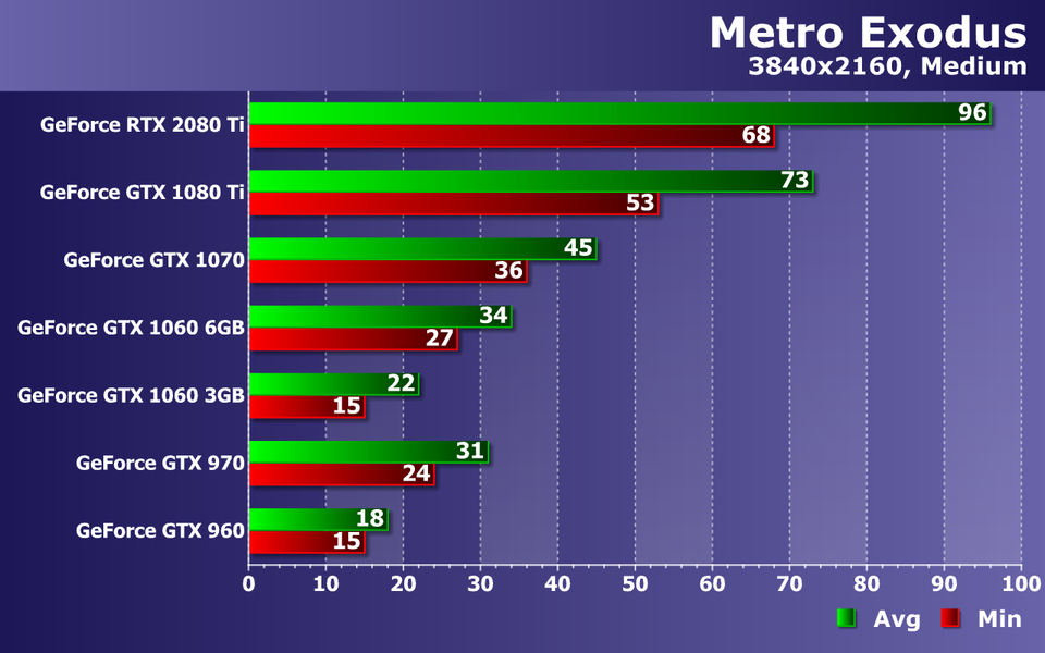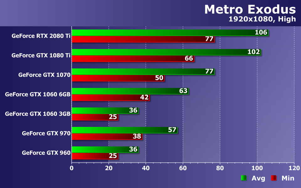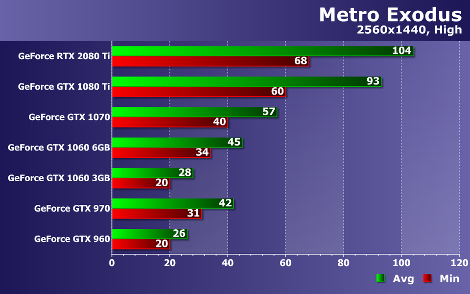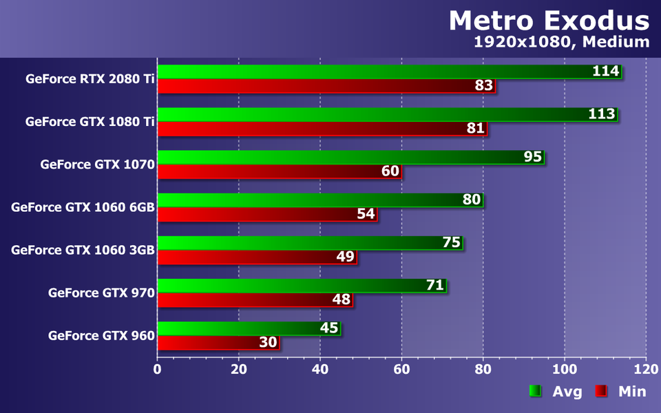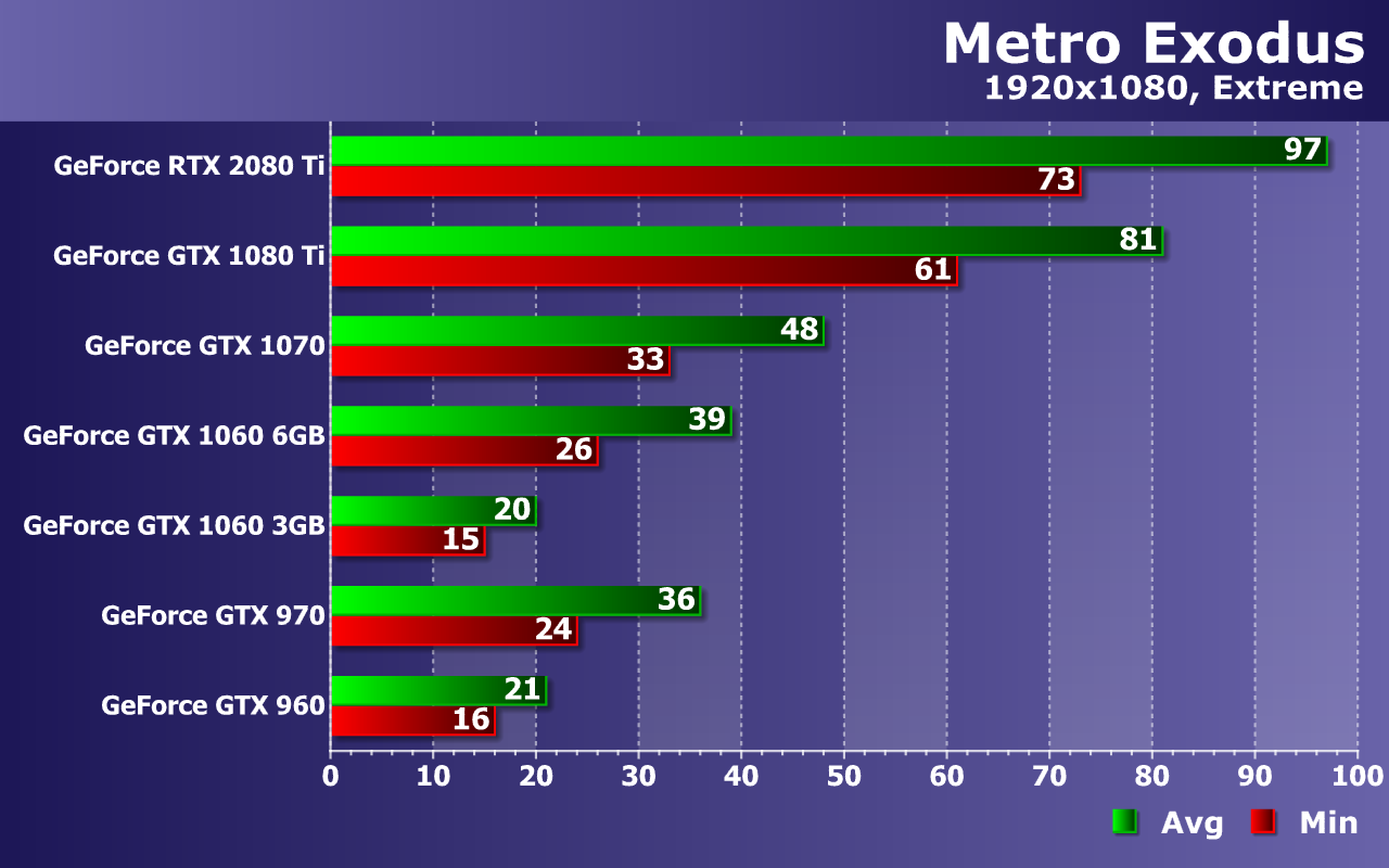 Этого не скажешь про GTX 970 и GTX 1060 6GB — два середнячка близки к 60 FPS, но лишь в среднем. Хотя при 38—42 FPS как минимум и 57—63 FPS в среднем, играть в Metro Exodus в любом случае будет весьма приятно. А еще лучше — на GTX 1070, которая дает почти идеальную частоту кадров, ну а пара самых мощных видеокарт: GTX 1080 Ti и RTX 2080 Ti, все так же упираются в CPU и их производительности достаточно для мониторов с частотой обновления 75—100 Гц, особенно при наличии поддержки технологии адаптивной синхронизацией G-Sync или Adaptive-Sync.