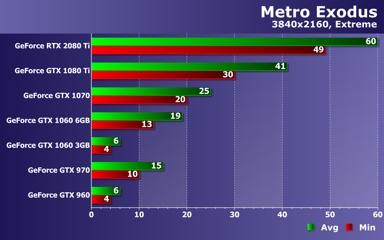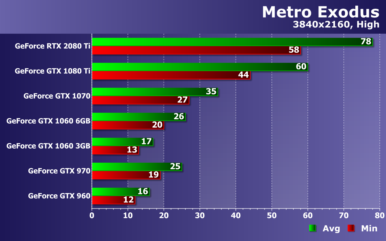 В остальном, если не трогать сверхтребовательную трассировку лучей, игре Metro Exodus в Full HD-разрешении при высоких настройках хватит и видеокарт уровня GeForce GTX 1060, но обязательно с 6 ГБ видеопамяти! Вариант с 3 ГБ способен показать приличную частоту кадров только при средних настройках, как показали тесты. Так что объем 4 ГБ видеопамяти мы считаем минимально допустимым, а лучше иметь 6—8 ГБ. А вот большего игра точно не требует даже при максимальных настройках с RTX в 4K-разрешении. Для разрешения 2560×1440 и средних настроек все так же хватит GTX 1060, а вот для высоких настроек желательна уже видеокарта от GTX 1070 и выше. Экстремальные же настройки покорятся только топовым GPU, как и 4K-разрешение — даже при просто высоких настройках. При максимальном уровне качества в 4K на GTX 1080 Ti игра будет еле шевелиться, так что любителям максимума во всем придется раскошеливаться на RTX 2080 Ti без вариантов.