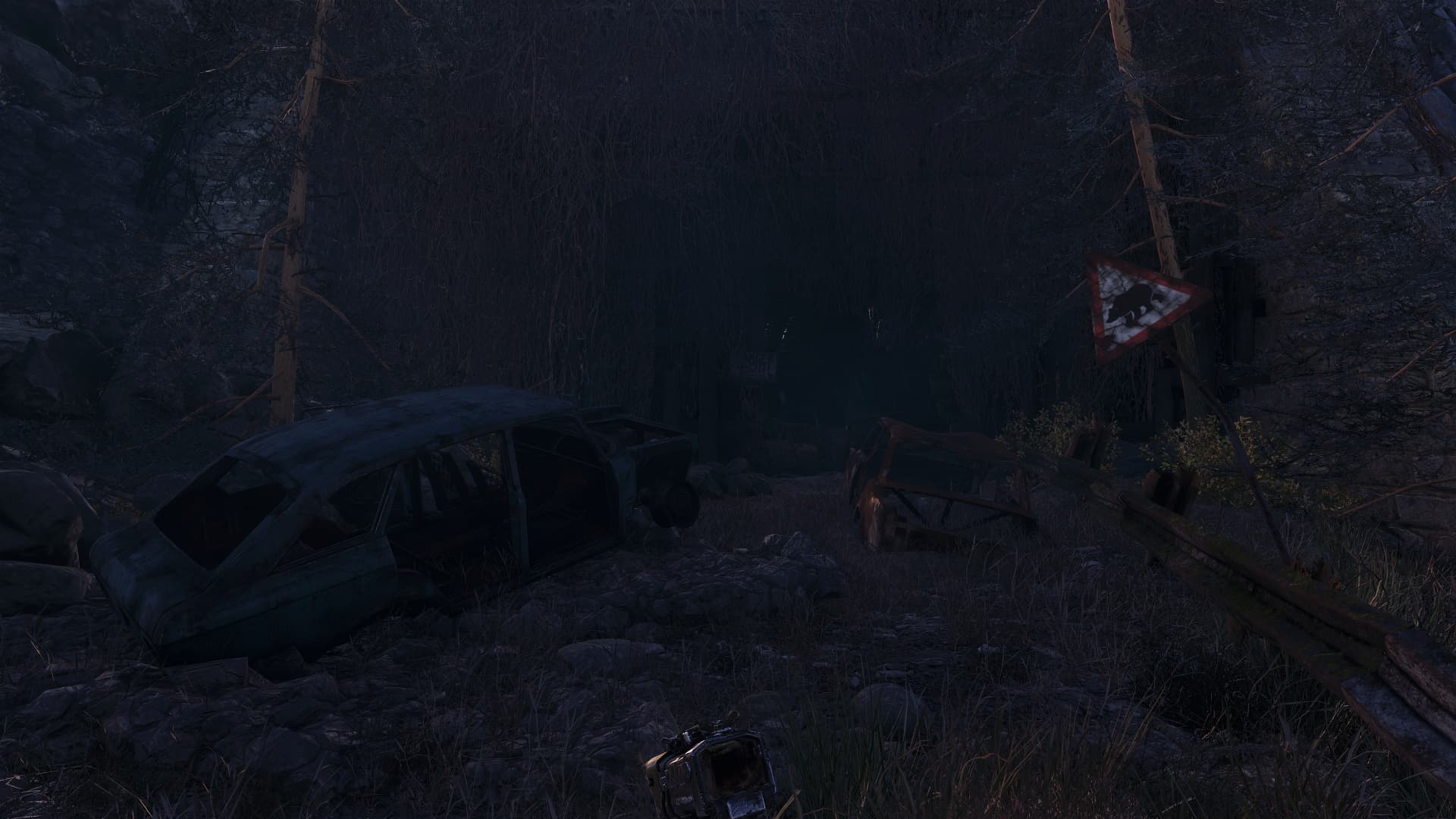 Посмотрите, насколько серьезно меняется картинка при включении трассировки — вместо плоского массива пикселей выходит вполне реалистичный объем. Внутри кузова ИЖ «Комби» и под ним — темные тени, как и в тоннеле впереди, а камни и деревья подсвечены небом.