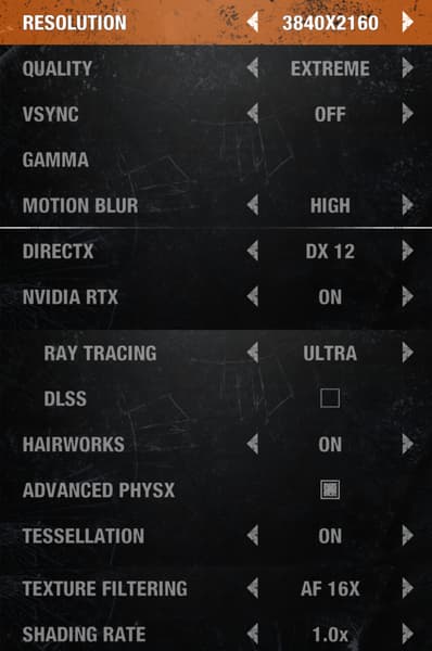 Довольно необычен набор настроек качества в игре. По сути, большая их часть сгруппирована в единственную настройку качества Quality, которая регулируется от Low до Extreme и отвечает за большинство параметров рендеринга — кроме тех, которые вынесены отдельно: выбор графического API, настройки видеокарт Nvidia GeForce RTX, технологии PhysX и HairWorks, а также тесселяции, текстурной фильтрации и Shading Rate. В Quality входит также и полноэкранное сглаживание методом TAA — нетребовательной постфильтрации, которая всегда включена.