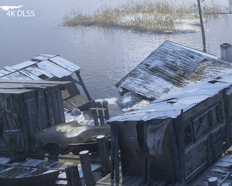 Хорошо видно, что DLSS хоть и в общем хуже полноценного 4K-рендеринга, но очень неплохо справляется с делом — точно лучше банального рендеринга в 1440p и вывода в 4K. Ступенек с DLSS явно меньше. А местами сглаживание работает даже чуть лучше родного 4K — посмотрите на доски крыши справа. И если раньше мы сами не включали DLSS в этой игре в принципе, так как даже просто сниженное разрешение рендеринга выглядело лучше, то теперь DLSS работает уже очень хорошо!