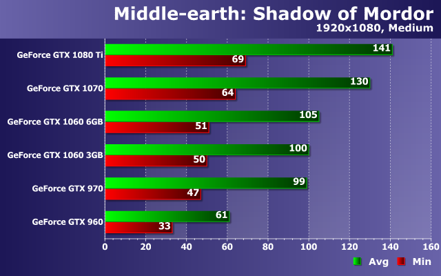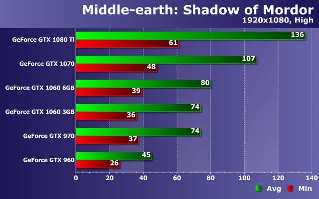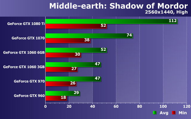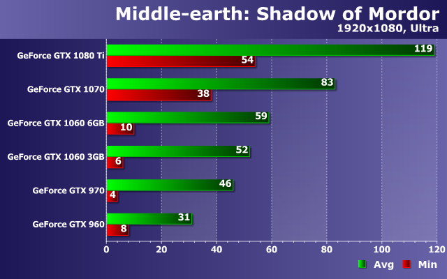 А вот младшей модели предыдущего поколения GeForce GTX 960 ничего не поможет, она показала лишь 31 FPS в среднем, хотя и обогнала по минимальному показателю платы с 3 и 3,5+0,5 ГБ видеопамяти. Первая мощная модель нынешнего поколения в виде GeForce GTX 1070 справляется с условиями максимальных настроек качества в Middle-earth: Shadow of War довольно легко, показывая более 60 FPS в среднем, хотя FPS все же будет падать и ниже. Только для топовой GTX 1080 Ti разница по скорости между профилями High и Ultra оказалась невысокой из-за все того же упора в производительность одного ядра CPU, и этой видеокарты хватает для полноценного комфорта, хоть и с редчайшими падениями чуть ниже 60 FPS.