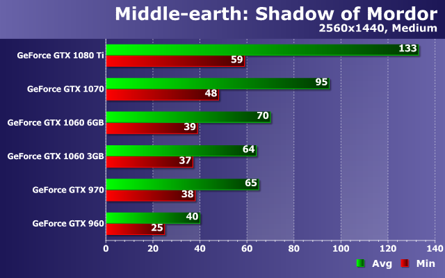 Более слабые видеокарты в режиме максимальных настроек в разрешении WQHD с работой не справляются. Даже модель среднего уровня GeForce GTX 1060 с 6 ГБ памяти обеспечила минимальную частоту кадров лишь в 9 FPS, что заметно ниже планки комфорта, хотя средняя частота была ровно 40 FPS. GeForce GTX 970 и GTX 1060 3GB еще чуть медленнее, а GTX 960 еще ниже. При установке ультра-настроек игра Middle-earth: Shadow of War более всего требовательна к объему видеопамяти, поэтому есть смысл поставить все настройки на ультра, кроме разрешения текстур.