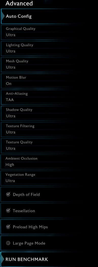 К счастью для нас, в игре есть встроенный тест производительности, помогающий подобрать идеальные настройки для обычных пользователей и серьезно облегчающий жизнь тестеров. Для того, чтобы протестировать производительность рендеринга в игре, нужно открыть меню настроек Display, выставить полноэкранный режим, отключить вертикальную синхронизацию и динамическое разрешение, а максимальную частоту кадров (Max FPS) выставить в неограниченную. Далее в продвинутых настройках Advanced Options выставить необходимые параметры качества рендеринга и запустить тест при помощи выбора опции Run Benchmark в самом низу.