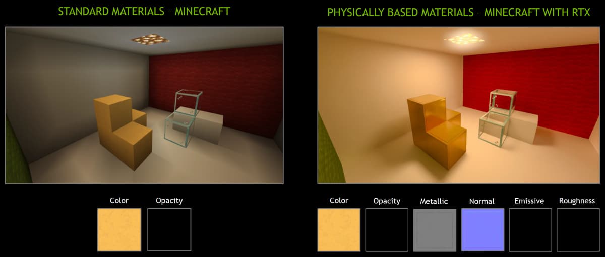 Большинство текстур в базовой версии Minecraft используют только два слоя (цвет и прозрачность), чего явно мало для реалистичного рендеринга различных поверхностей. Поэтому в RTX-версии к уже упомянутым слоям были добавлены текстурные слои, описывающие характеристики отражательной способности, светимости, степень шероховатости, а также карты нормалей и высот для имитации различных материалов, встречающихся в реальности.