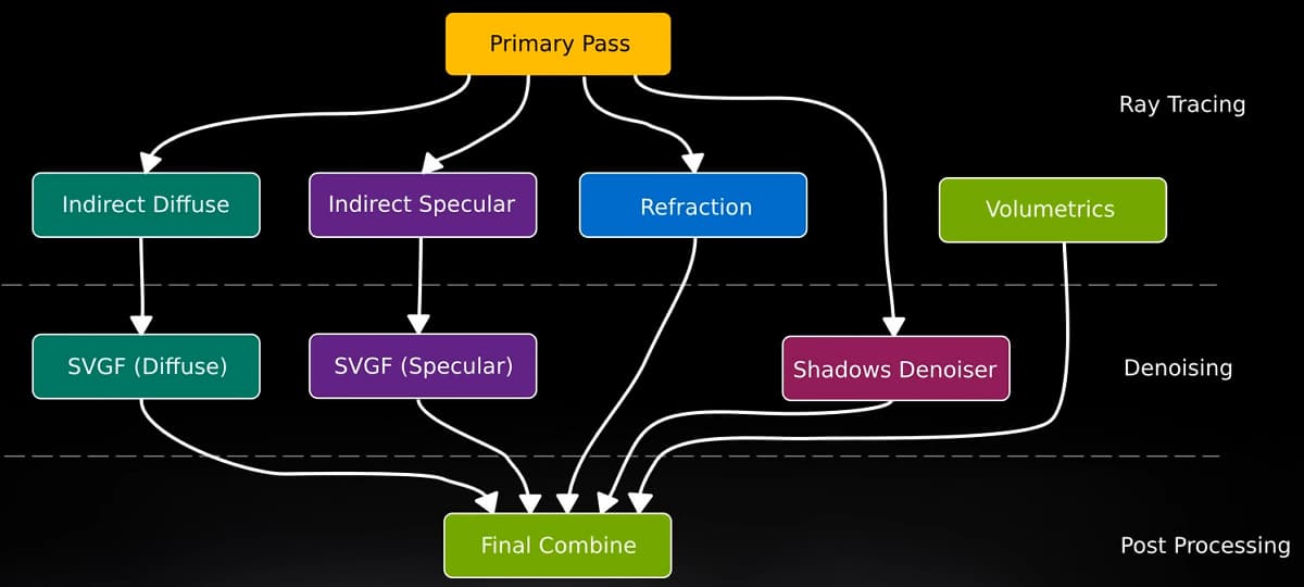 Рендерер в трассированной версии игры многопроходный, им рассчитывается отдельно рассеянная (diffuse) и отраженная (specular) составляющие освещения, а также есть отдельные проходы для отрисовки преломления лучей света и объемного освещения. Затем все буферы комбинируются в процессе постобработки, а частицы вроде дождя дополнительно пририсовываются при помощи растеризации.