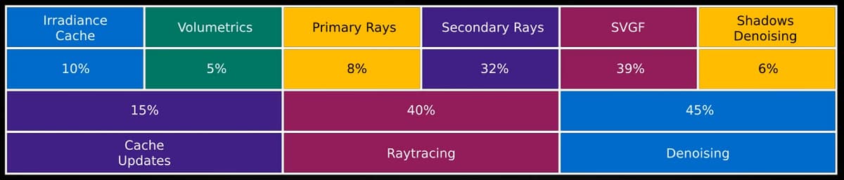 15% времени построения кадра занимает обновление кэшей светимости (интенсивности излучения — irradiance) и объемных эффектов, а сама по себе трассировка занимает лишь 40% времени кадра (из них расчет прямых лучей отнимает 8%, а непрямое освещение — 32%).