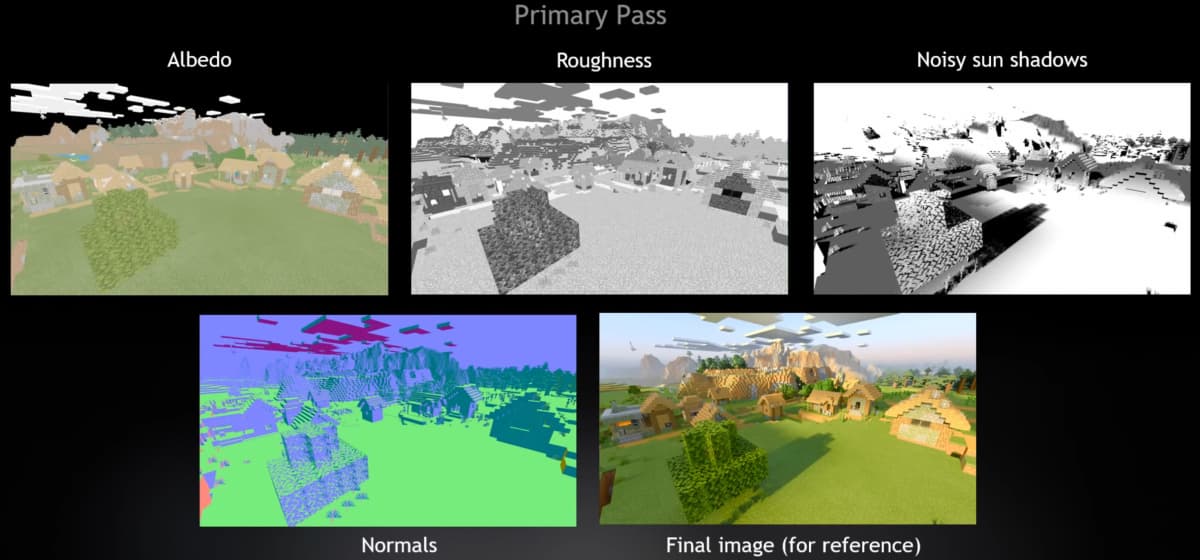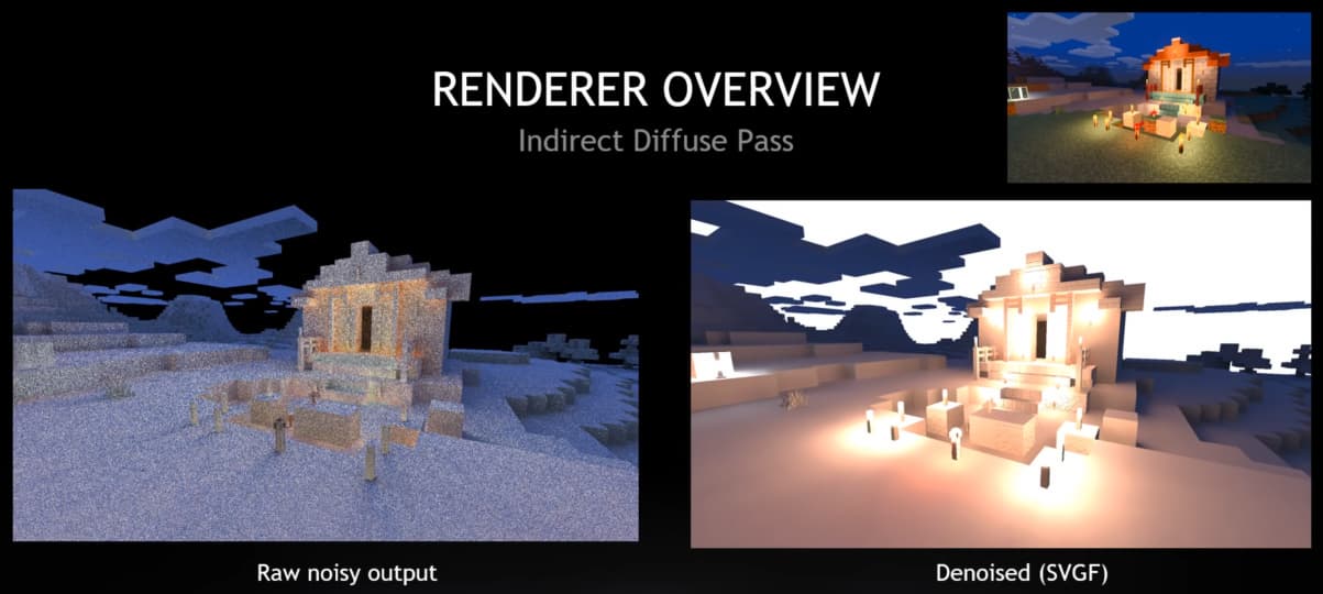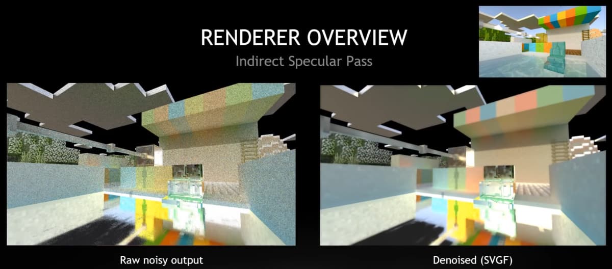 Главное в рендерерах с трассировкой — качественная оптимизация, в том числе по количеству лучей, ведь трассировка очень ресурсоемка. И тупой результат, полученный при малом количестве рассчитываемых на пиксель лучей, всегда получается слишком шумным, требующим максимально эффективного шумоподавления. В частности, в бета-версии Minecraft RTX используется три специфических фильтра шумоподавления — отдельно для diffuse, specular и теней.