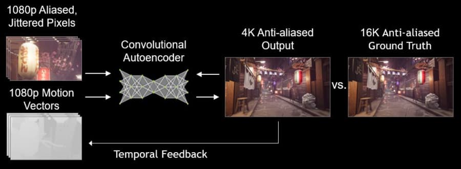 Новая версия DLSS использует Neural Graphics Framework (NGX) и нейросеть, специально натренированную на суперкомпьютерах на десятках тысяч изображений для того, чтобы из картинки низкого разрешения и буфера векторов движения реконструировать изображение в высоком разрешении и максимальном качестве. Эти задачи в теории можно выполнить и на универсальных вычислительных блоках, но с гораздо меньшей производительностью и эффективностью, а именно тензорные ядра и позволяют выполнить подобный алгоритм в реальном времени.