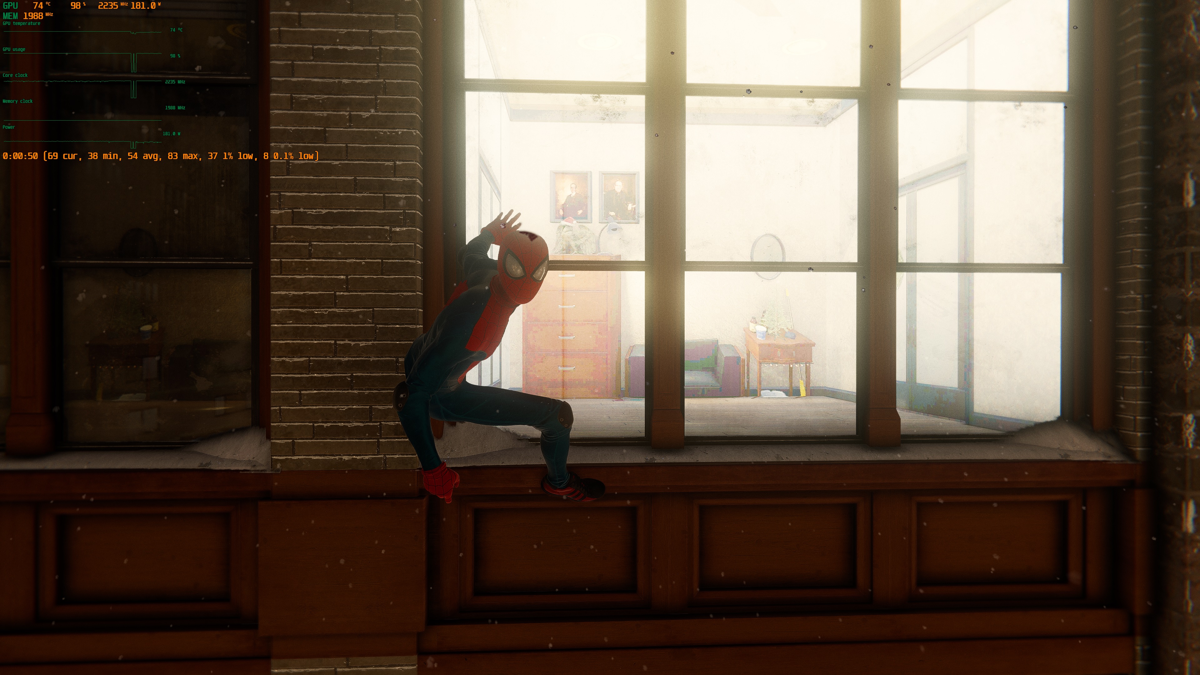 Игра Marvel’s Spider-Man: Miles Morales поддерживает RT (трассировку лучей), а также технологии Nvidia DLSS и AMD FSR. В игре достаточно много мест, где технология рейтрейсинга себя идеально демонстрирует : тени от Человека-паука на окнах зданий, и видимость через стекло обстановки в той или иной квартире внутри.