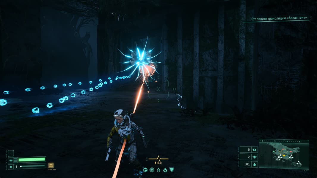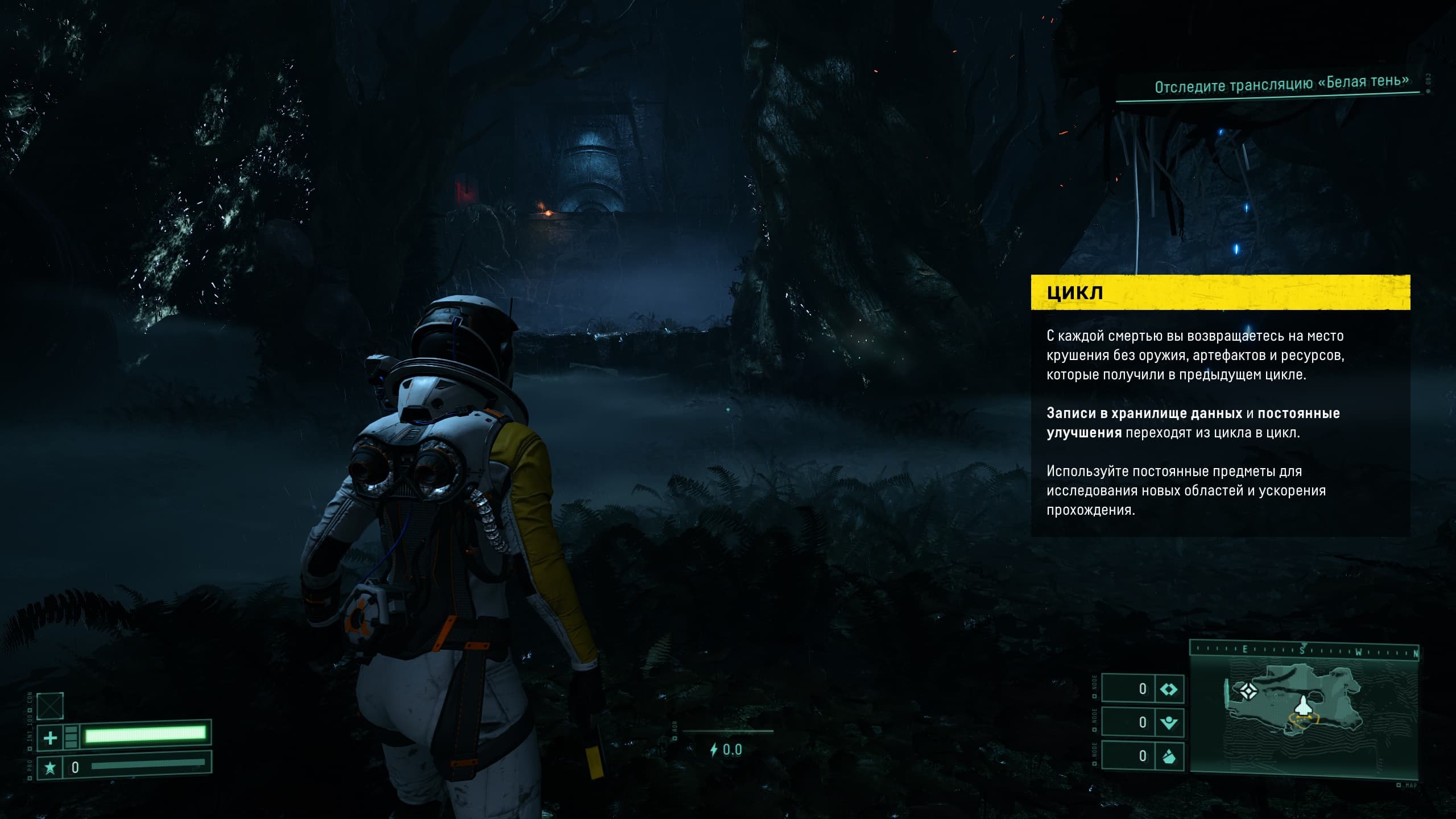 После каждой «гибели» мы возвращаемся на исходную точку приземления к кораблю, но уже без оружия и найденных в процессе прохождения предыдущего цикла повышающих статус и улучшающих героя элементов. Наша задача — запоминать, куда стоит приходить для возможности повышения здоровья и способностей, а куда стоит не ступать.